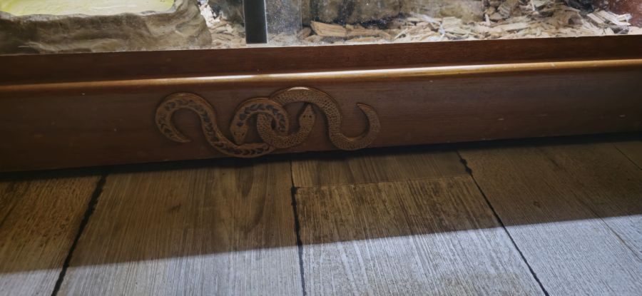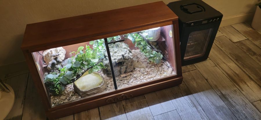Vivarium authentique fabriqué par un compagnon du devoir. 100x50x50cm en hêtre massif, tout équipé pierre chauffante, grotte, hygromètre, thermomètre, reserve d eau, eclairage bi ton, système de verrouillage à clés et deco.