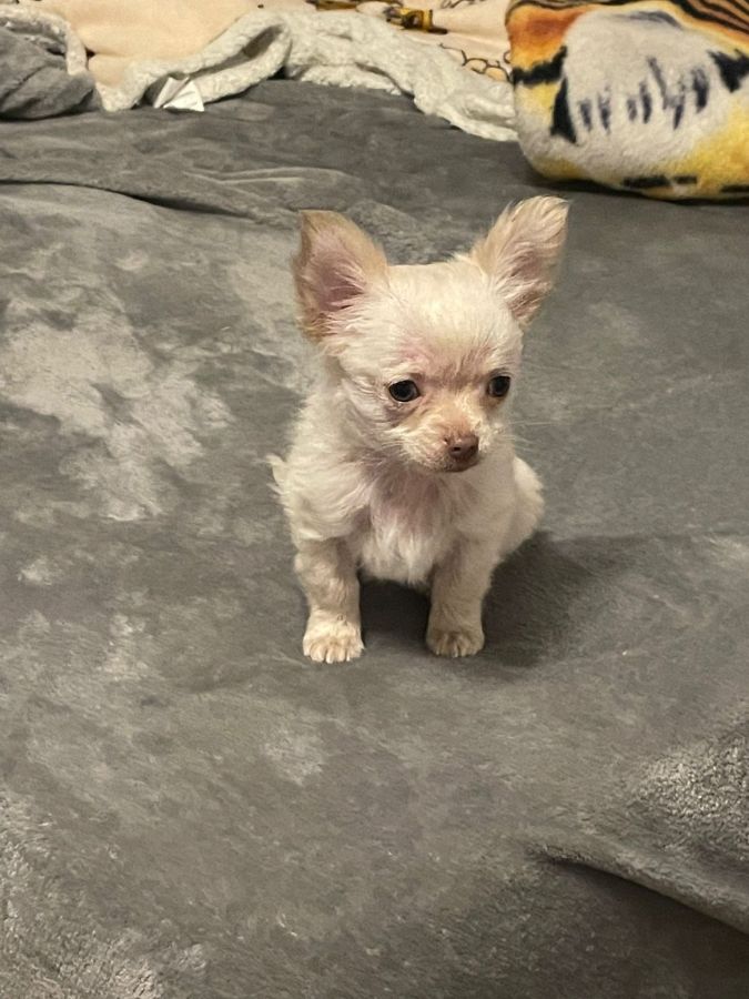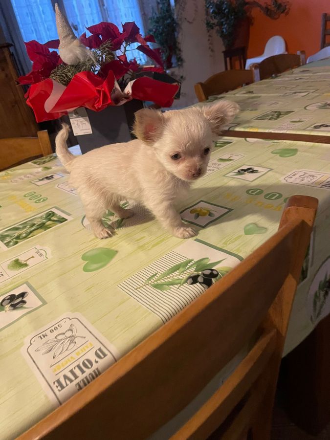1 chiot  chihuahua poil long blanc beige né le 27/11/2024. Câlin et joueur.