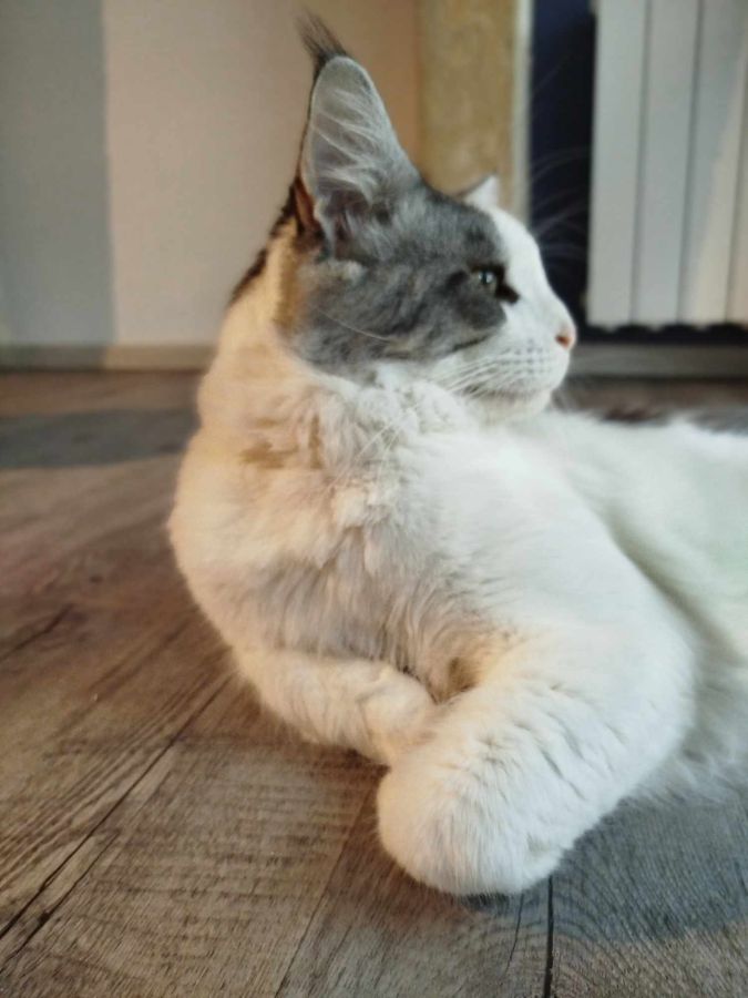 Jeune maine coon LOOF avec beau pedigree, d'un an et demi, Beau gabarit grand et élancé, il est blanc et bleu smoke, il fait 8.500 grs lors de sa dernière visite chez le vétérinaire, il a bon appétit, il mange de la viande et du poisson ainsi que des sans céréales haut de gamme à volonté, et il va encore évoluer. Il est indemne et testé pour les maladies génétiques du Maine coon HCM, Pkdef, SMA, il est en bonne santé, il a une belle lignée avec des champions. Il est proche des humains, comme tous les Maine Coon, il n'aime pas être seul ou isolé, il apprécie la présence humaine sans être une glue. Il est sélectif avec ses congénères, tendance à être dominant, il est impératif, qu'il soit le seul chat dans le foyer, pour sa quiétude et celle des autres. C'est vraiment la condition d'adoption que vous vouliez vraiment qu'un seul et unique chat. Il lui faudra un bel espace de vie et dans l'idéal un petit extérieur protégé pour ne pas le changer de ses habitudes. Si vous voulez en savoir plus sur ce beau loulou, n'hésitez pas à me contacter pour que l'on échange de vive voix.