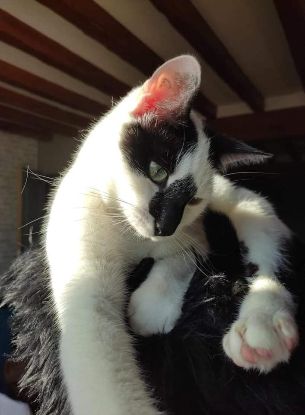 Azraël est atteint d'un calicivirus modéré, se présentant chez lui par une inflammation des gencives qui est la forme symptomatique à surveiller mais il est fort possible qu'il se porte très bien jusqu'à la fin de sa vie, le risque zéro n'existant pas. Il devra être le seul chat de la maison. Un compagnon chien serait bien