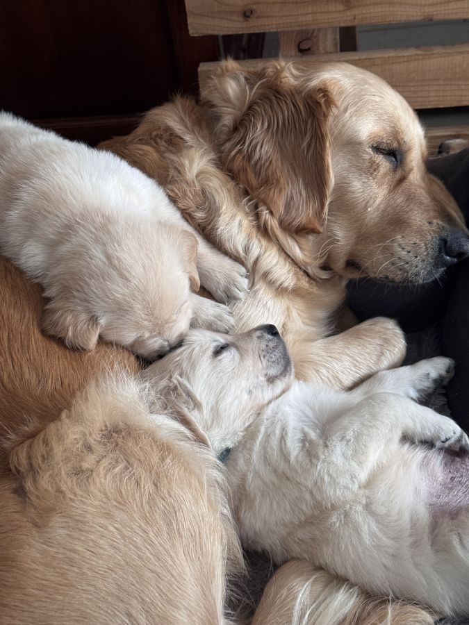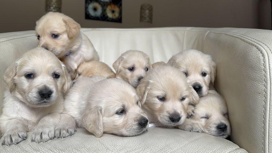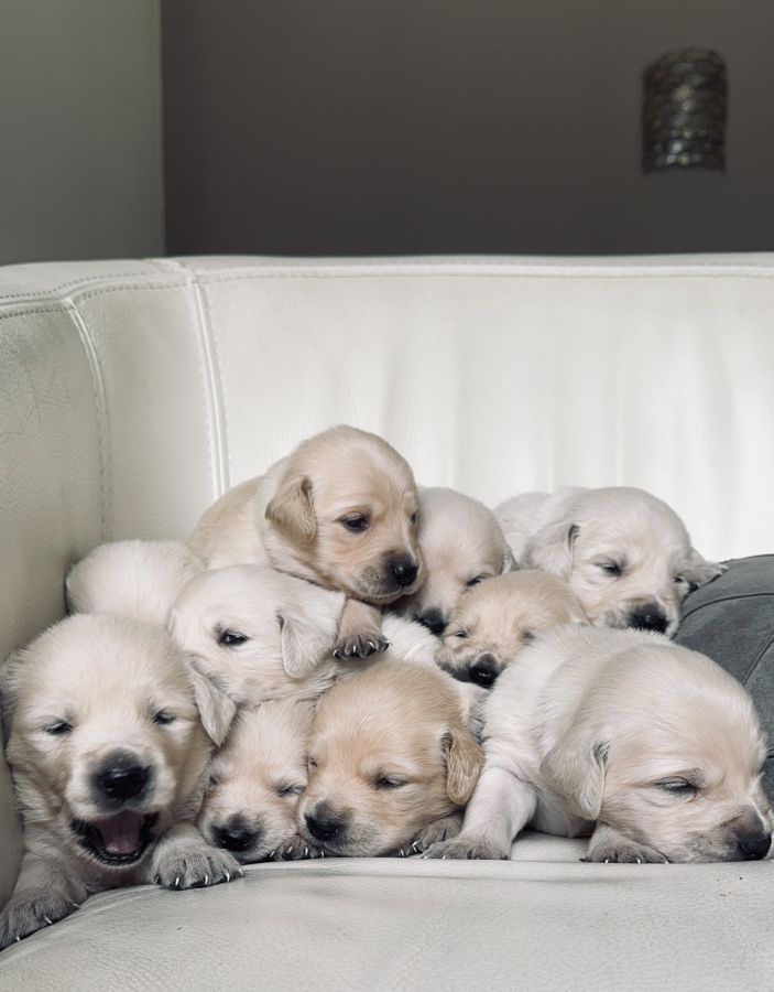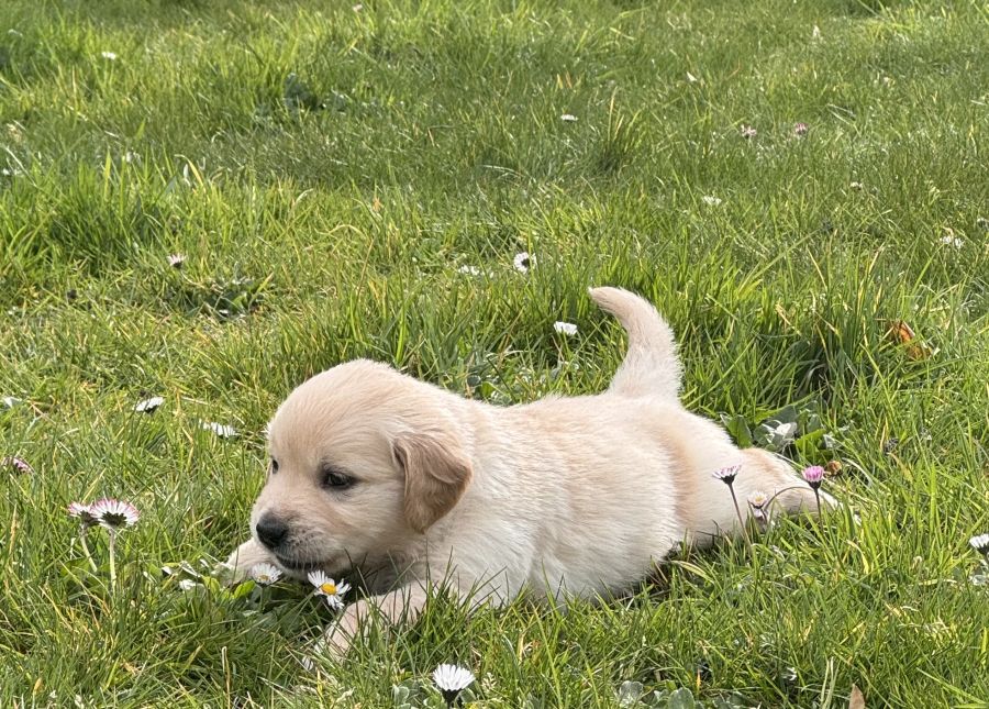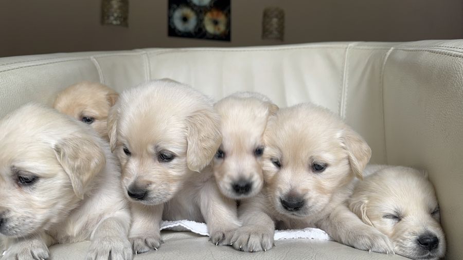 Vente de chiots ( 7 femelles et 3 mâles ) d’une magnifique portée de Golden Retrievers LOF (Livre des Origines Français), nés le 5 février 2025.