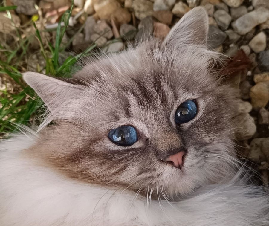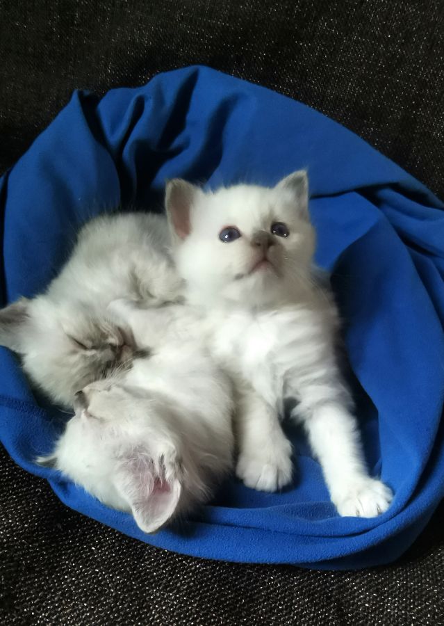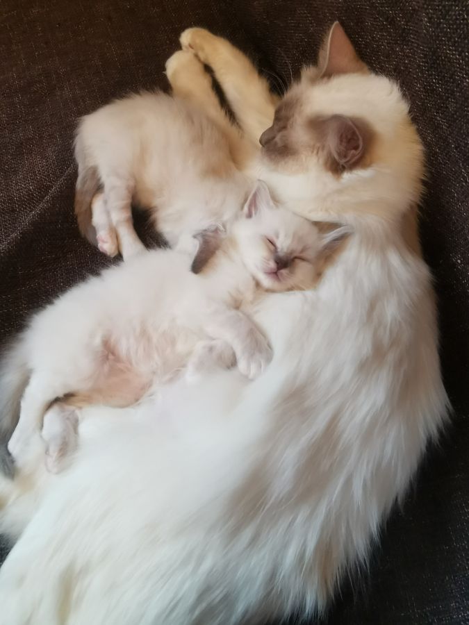 La très jolie Uzae de Naypyidaw (blue point) et le magnifique Toupet du fer sacré (blue tabby) ont donné naissance le 27-12-2024 pour notre plus grand plaisir à 3 magnifiques petits chatons mâles aux yeux bleus... Pour notre jeune chatte de 1 an et demi, au sommet de sa forme, c'est sa première et dernière porté, elle a été une mère très tendre, attentive et joueuse...