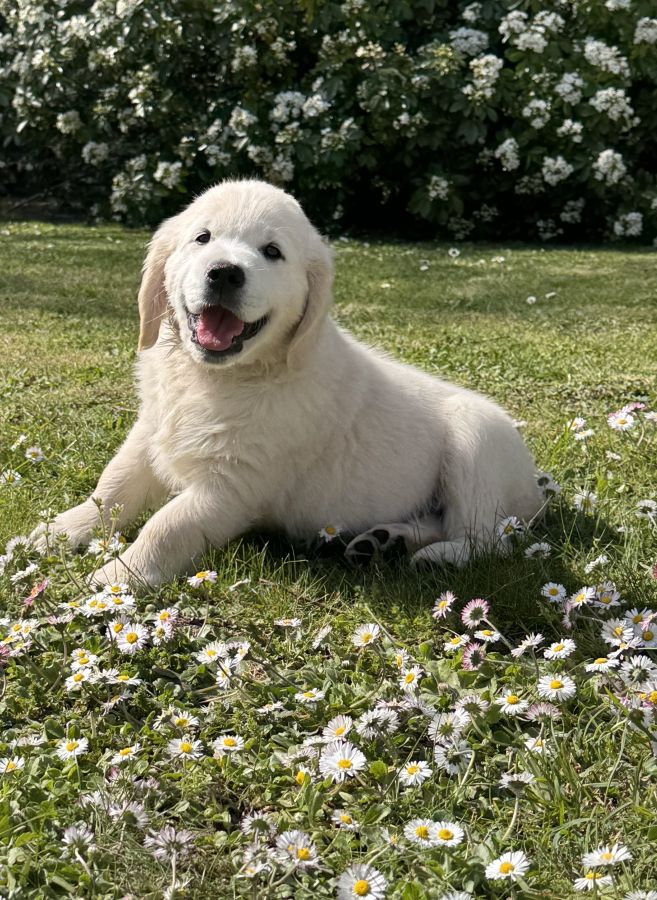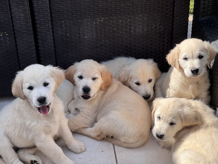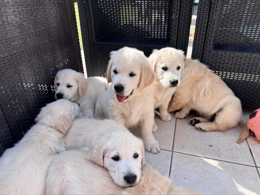Nous proposons à la vente 10 adorables chiots Golden Retrievers LOF, issus d’une superbe portée née le 5 février 2025 :
