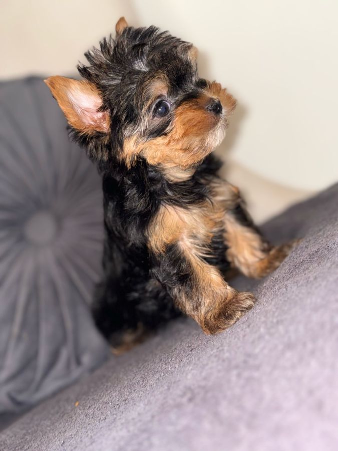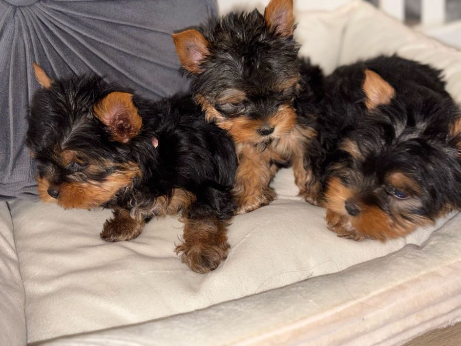 Yorkshire toy née le17 février d'une portée de 3, 1 mâle et 2 femelles petit gabarit queue écourtée vermifugée régulièrement vaccinée identifiée par puce électronique et certificat de bonne santé, certificat de vente maman 2k papa lof 2k2 parents visibles sur place 1000e mâle 1200 les femelles
