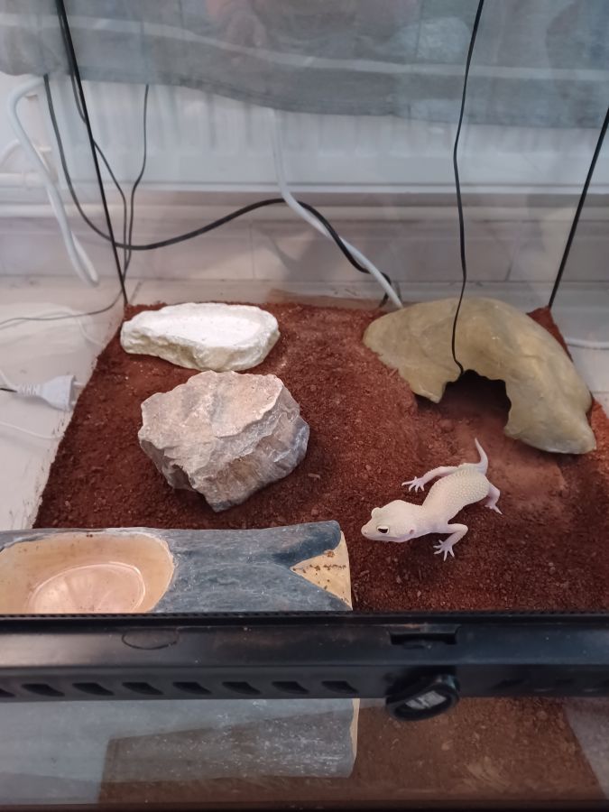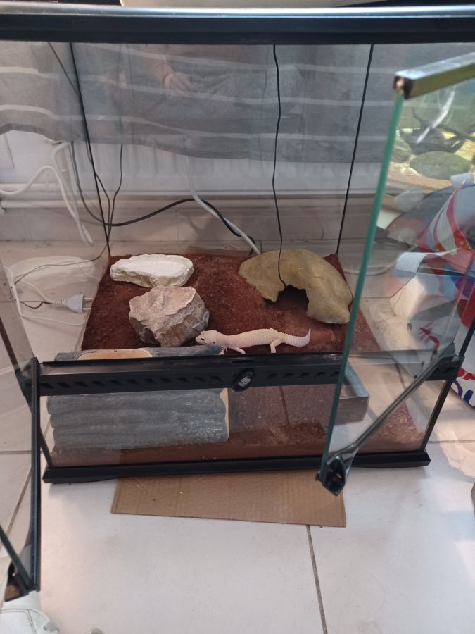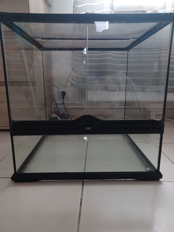 Elle est vendu avec un terrarium exoterra 45x45x45 (pour dépanner), comprenant tapis chauffant, boîte à mue + gamelle à eau, une cachette.