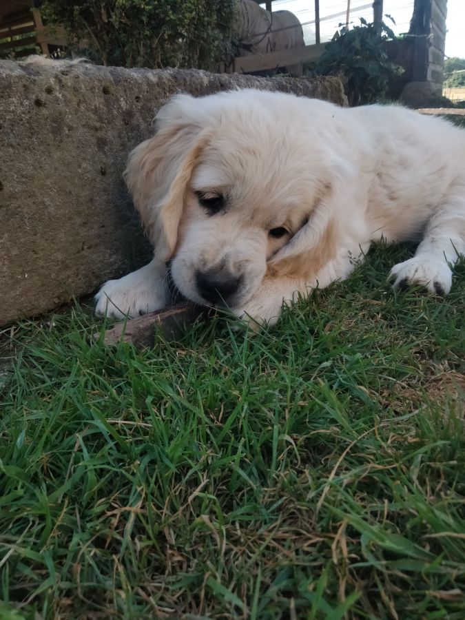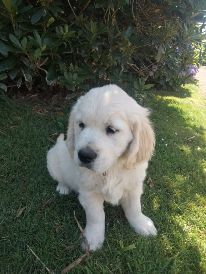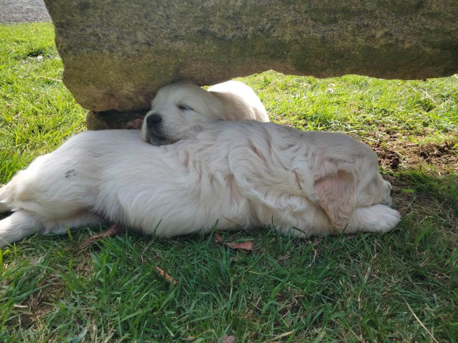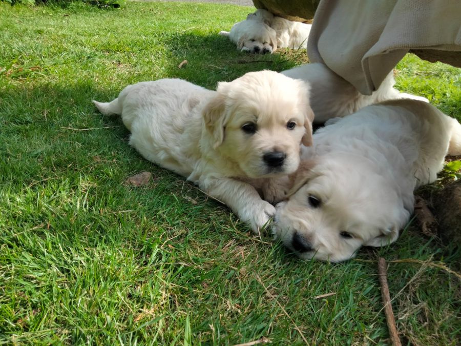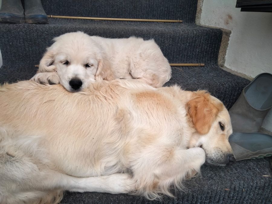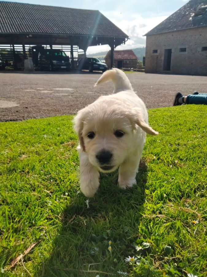 La mère : UTESSE DE KERLOUIS DES JARDINS D EPONA est notre chienne depuis 2 ans issue du même élevage mais évidemment d'une lignée différente. Vie au quotidien à nos côtés avec deux jeunes enfants, d’autres animaux et présente un comportement très Golden: calme, ou active et joueuse ou préventive quand le facteur sonne au portail.