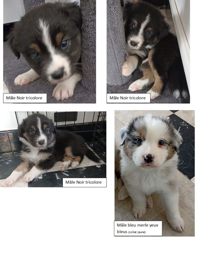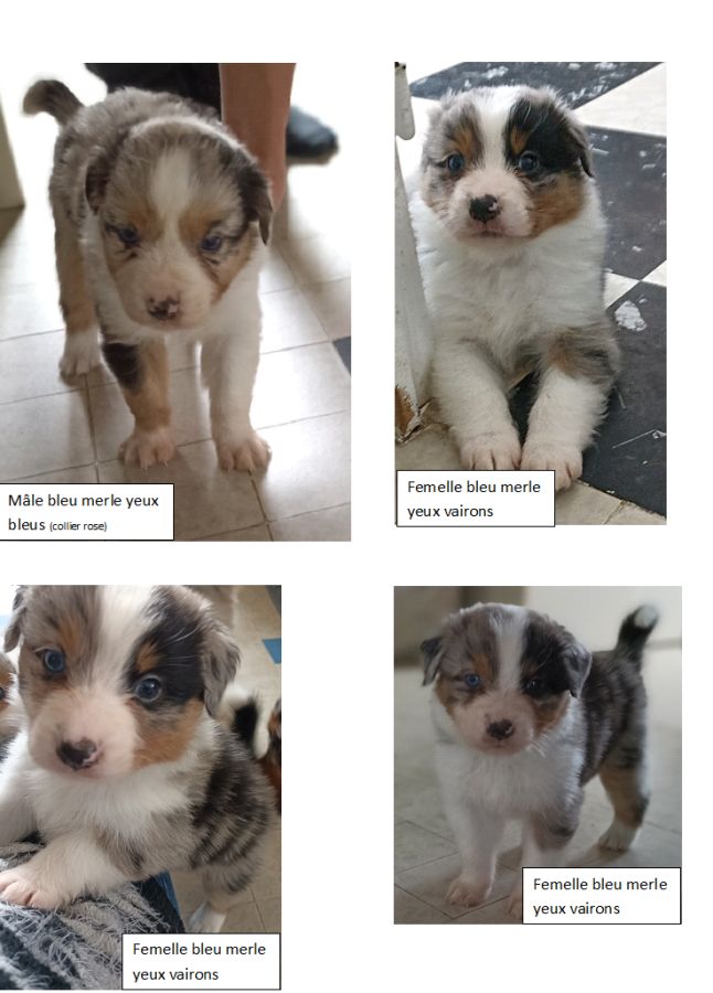 Topazy des terres du Bonheur (femelle bleue merle yeux vairons) et Oc Man de la lauze aux micoucouliers (mâle noir tricolore) ont donné naissance à une portée Lof de 5 chiots nés le 15/03/2025. Les parents sont testés ADN.