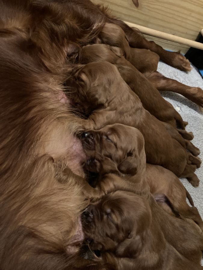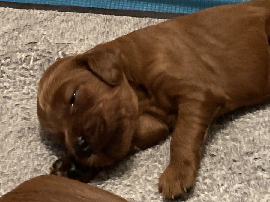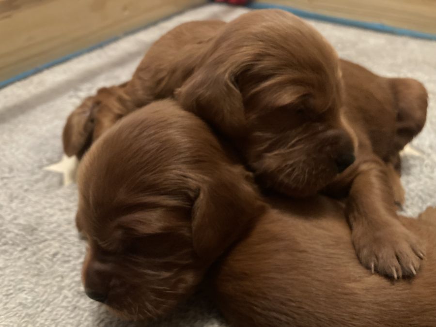 Chiots setters irlandais rouge nés le 17 avril 2025 du mariage de notre belle Rosa du bois de Balisy et de Pyrame du bois de Balisy.