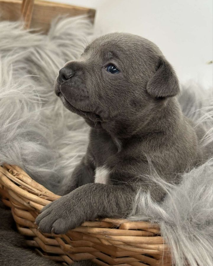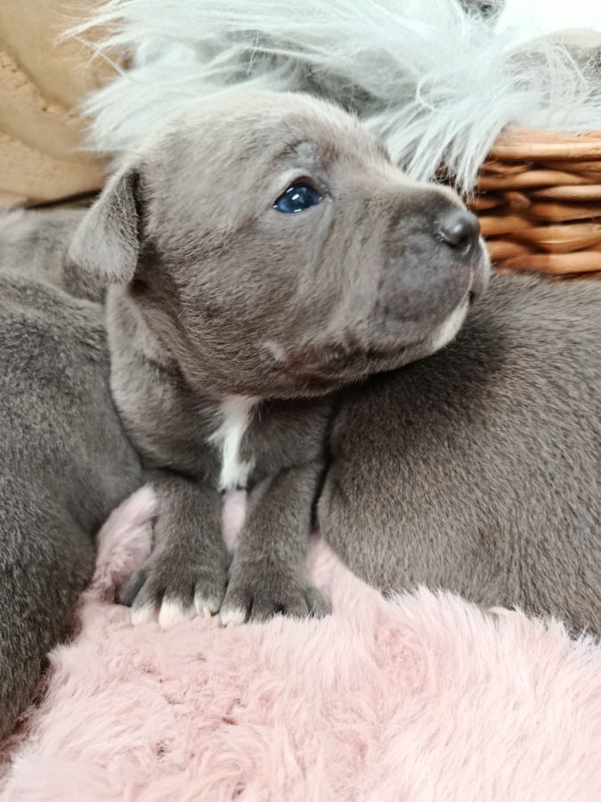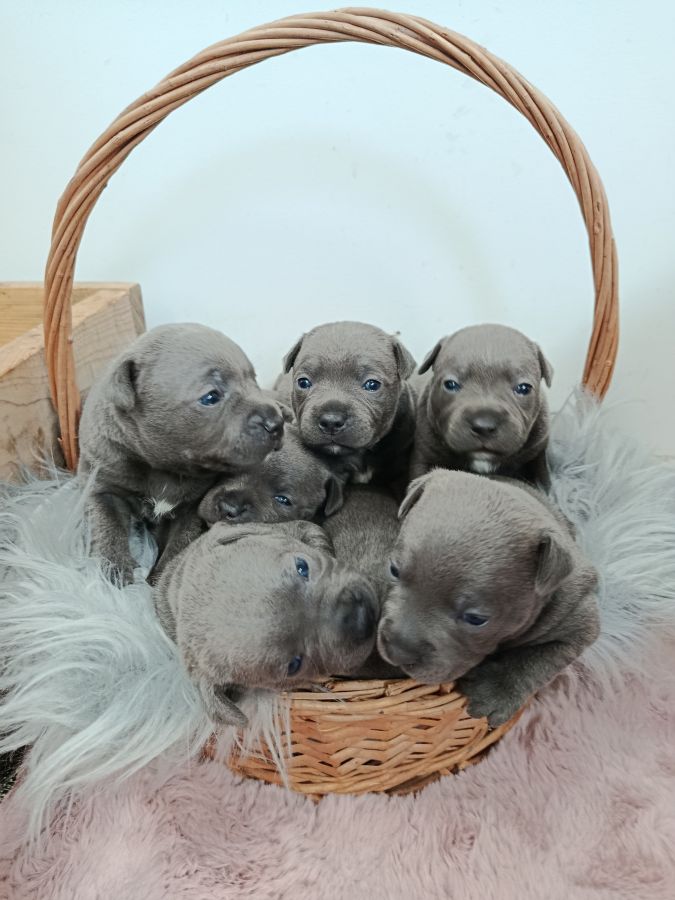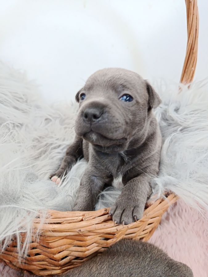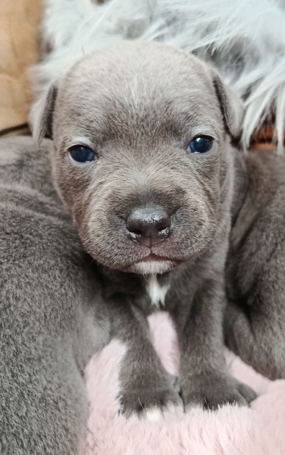 Pooky et Savannah ont le plaisir de vous annoncer l arrivée de leur bébés staffordshire bull terrier bleus .