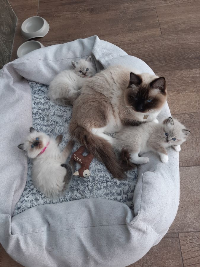 Une photo de la Maman, Uraya du Castel Piémont, robe Seal Point Mitted avec ses chatons.