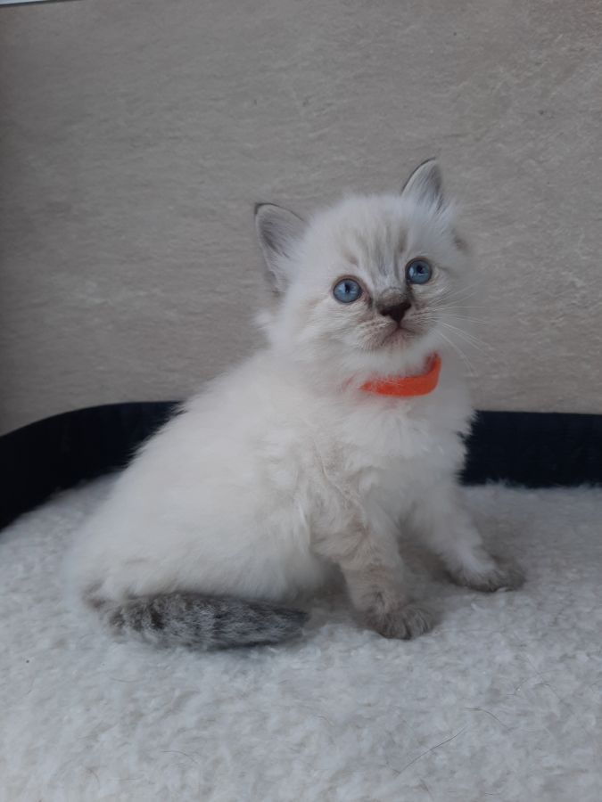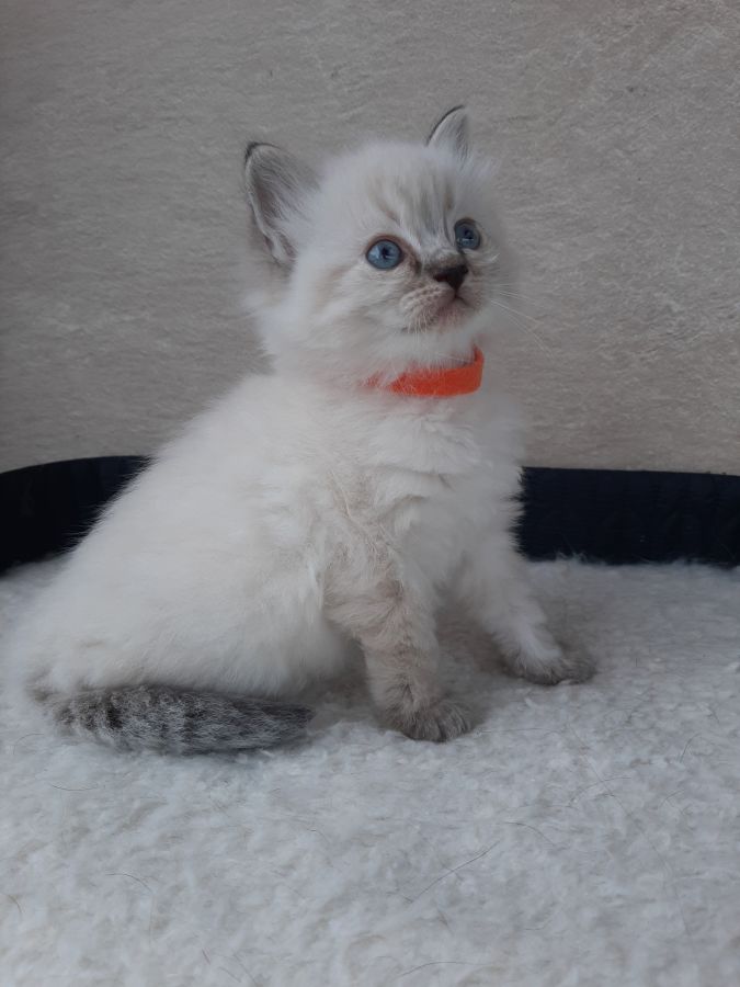 - Chaton femelle, collier orange, robe Seal Tabby Point (pattes grises)