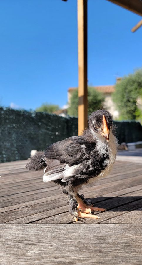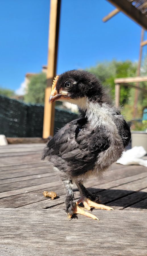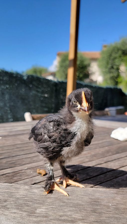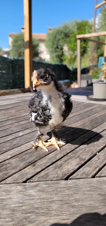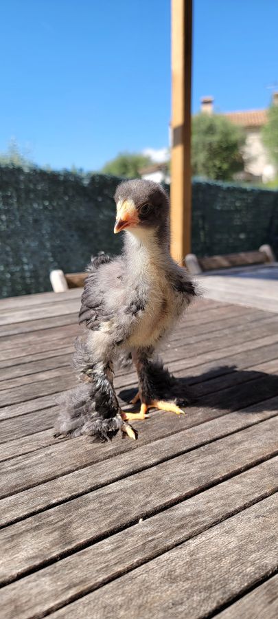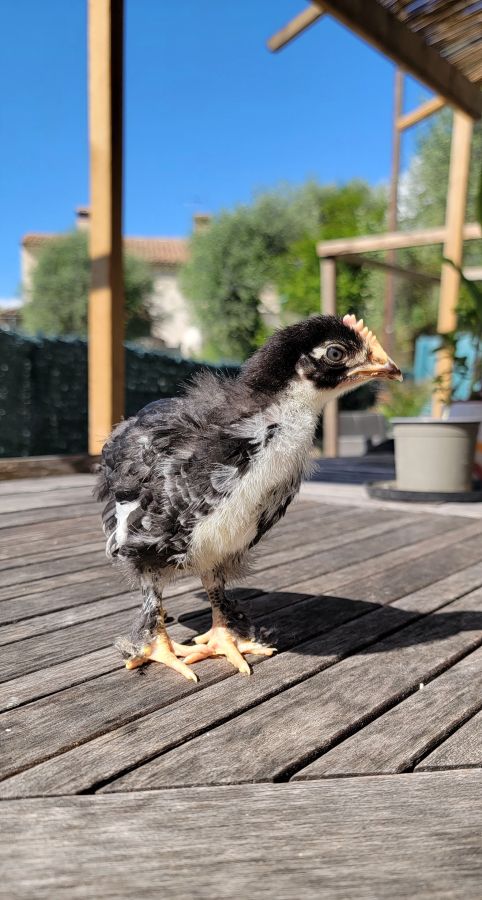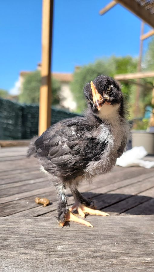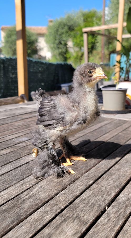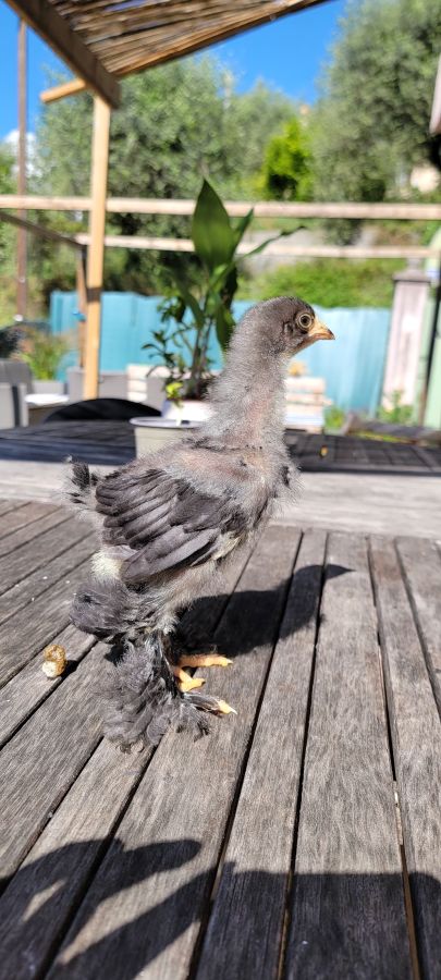 Il y a 1 Brahma GR bleu, 1 Marans (oeufs chocolat) et 1 Olive egger (oeufs vert).