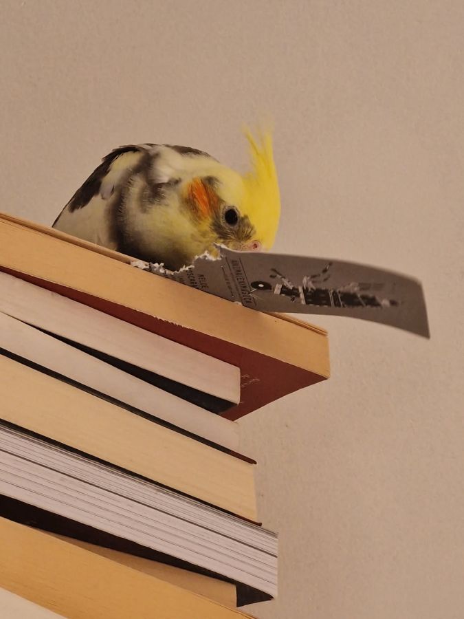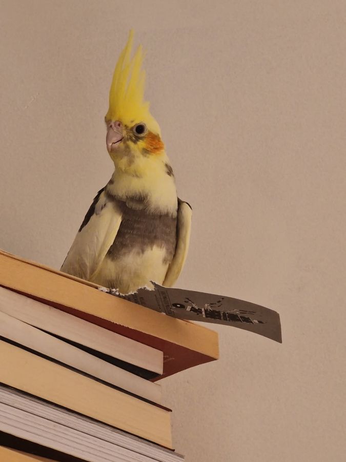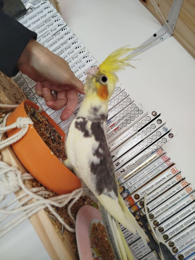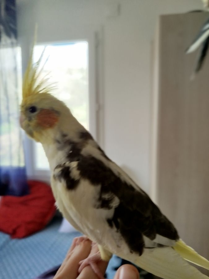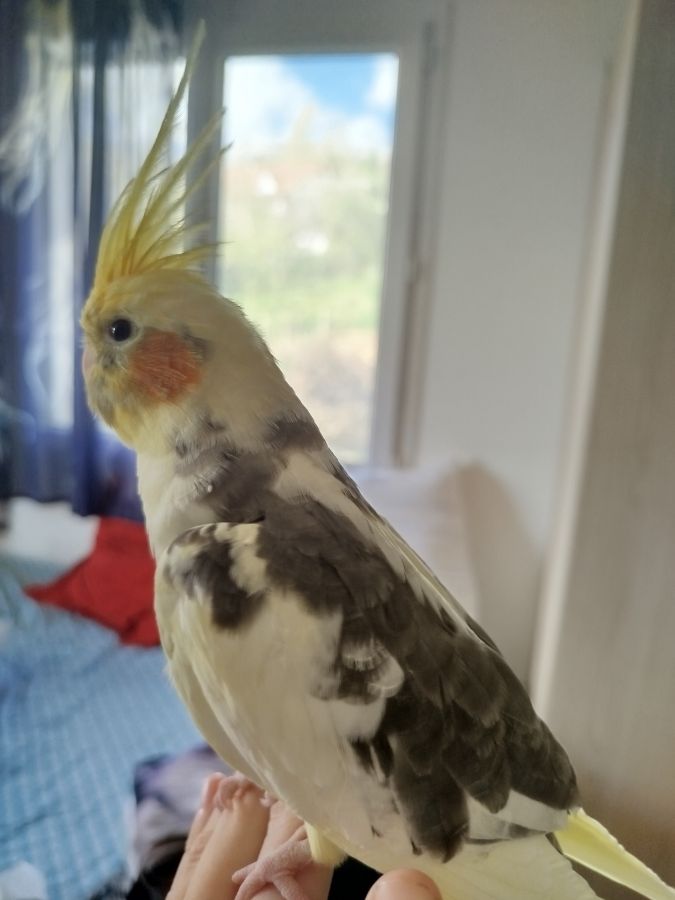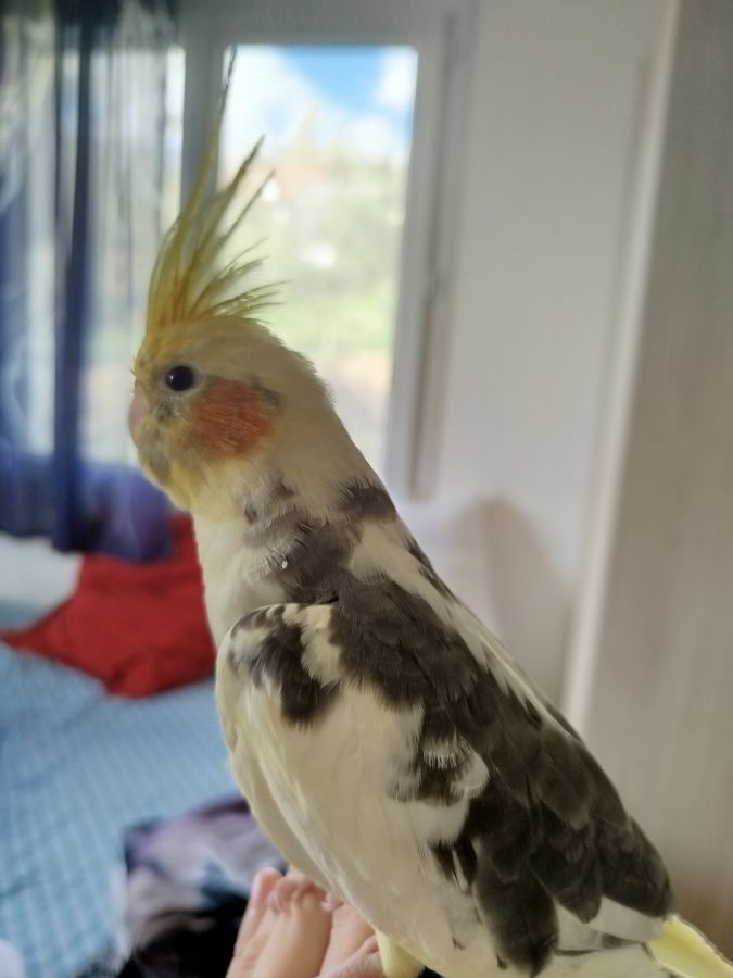 Calopsitte de 5 mois (née le 25 Janvier 2025), sevrer, élever main avec ailes NON coupés, affectueux, nous pensons que c'est un male mais ne sommes pas sûre.