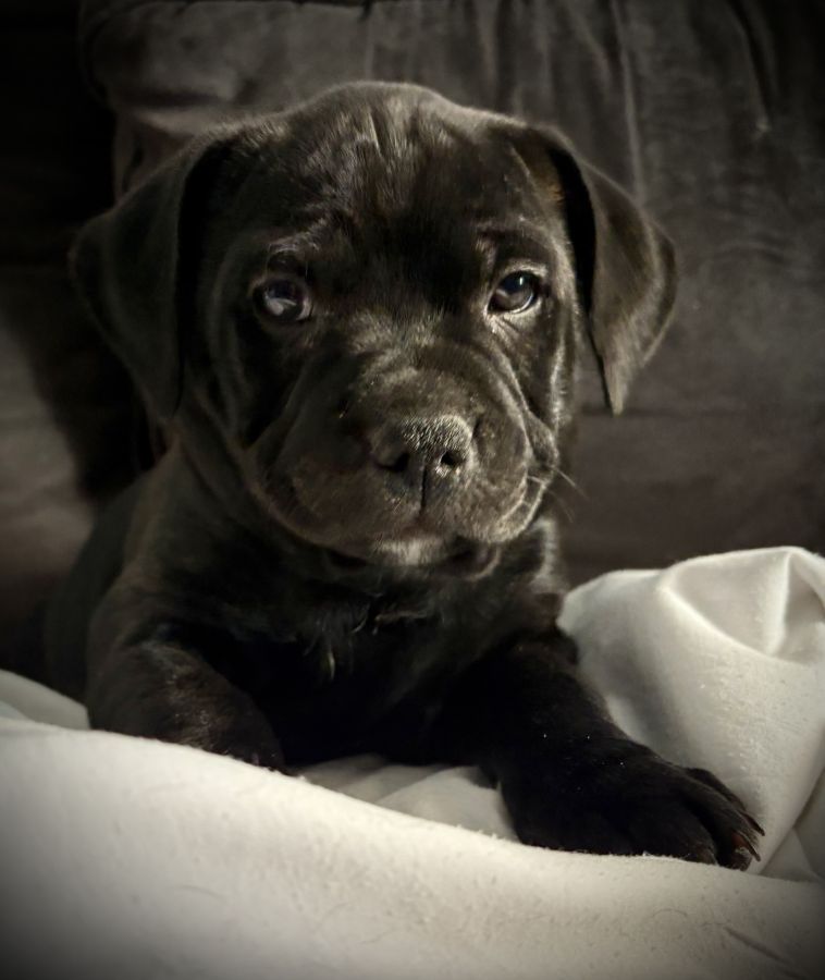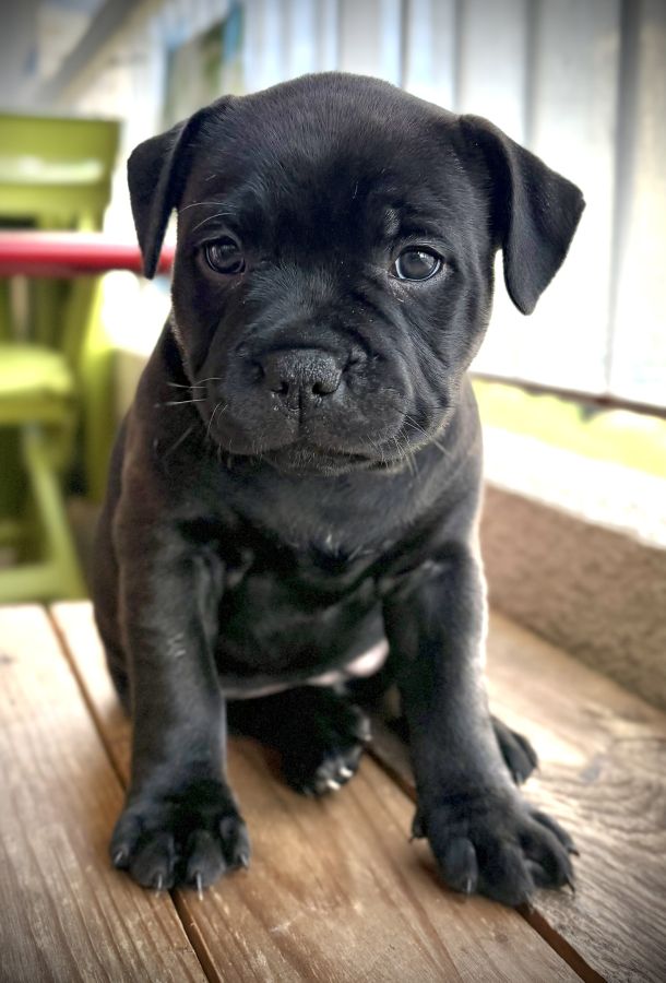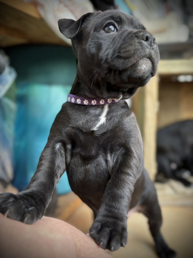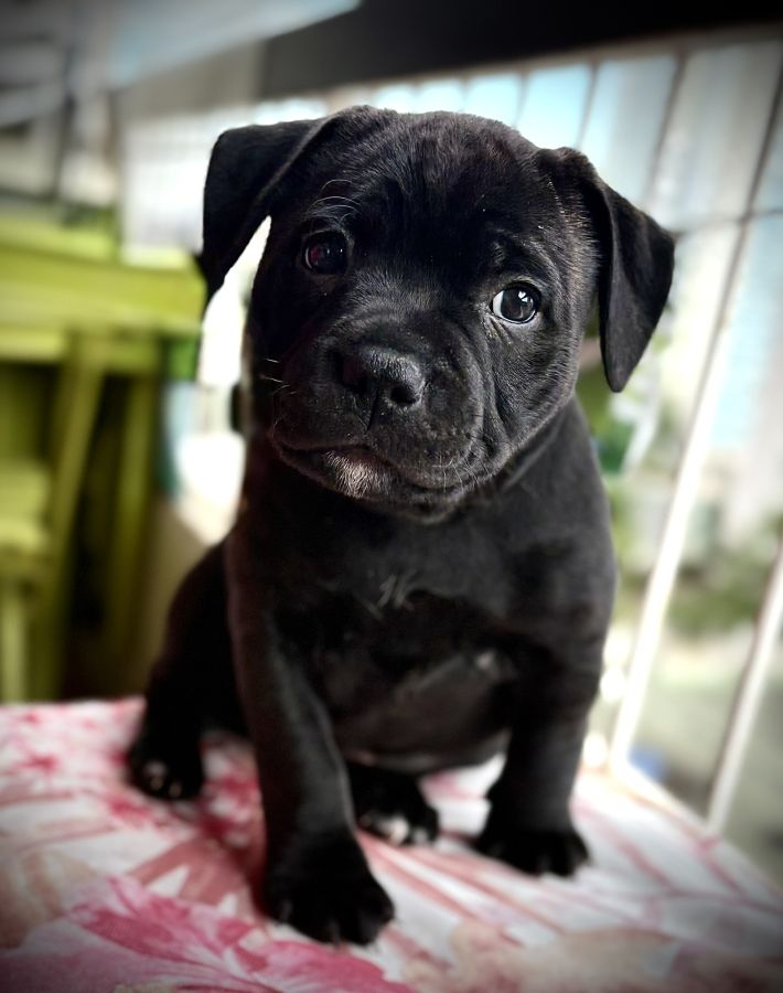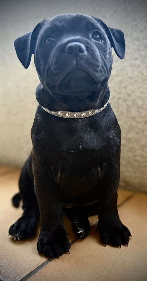 chiot staffie (staffordshire bull terrier) noir panachure blanc nés le 9 avril 2025 inscrit au livre des origines française.