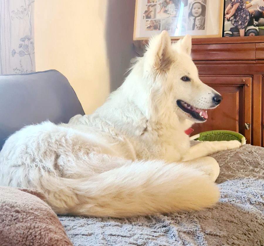 Angie est câline,joueuse,sociable et pot de colle.Avec un gros sous poil.