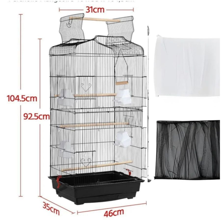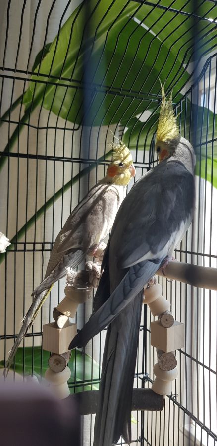 Couple perruche calopsitte reproducteur (un male gris foncé et une femelle gris clair) avec un cage noir (46x35x104.5cm ), 2 housses pour cage et accessoires.