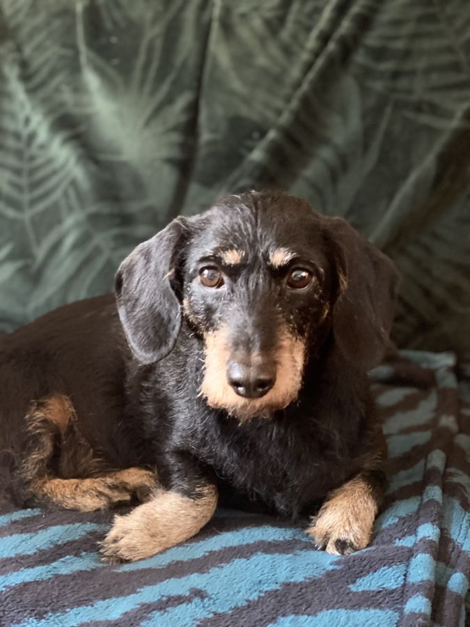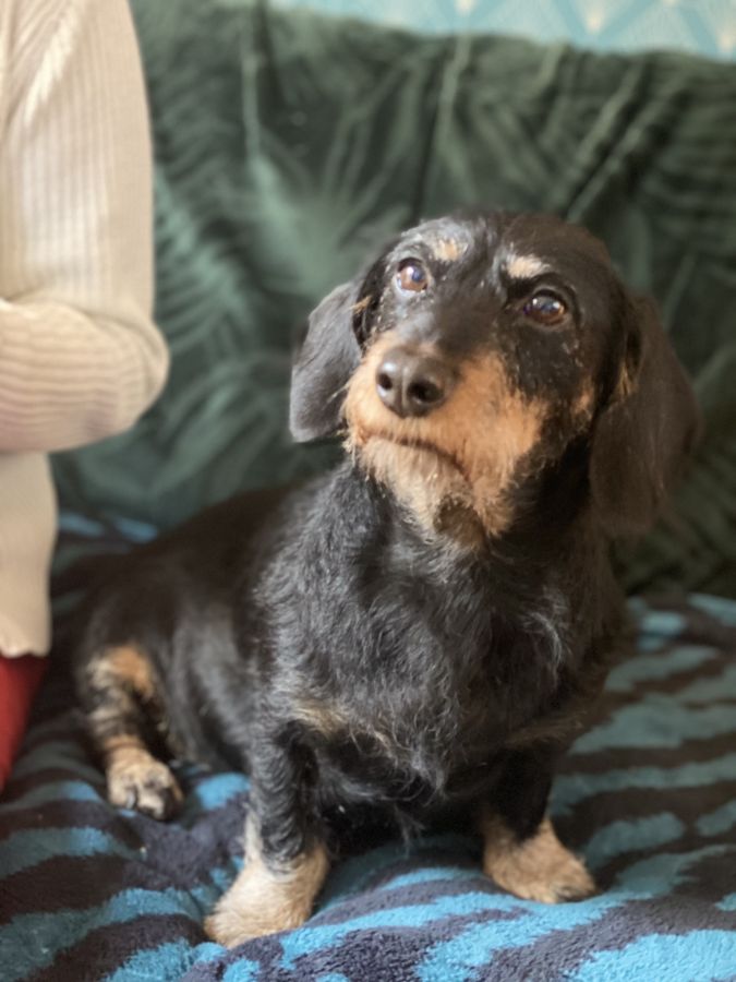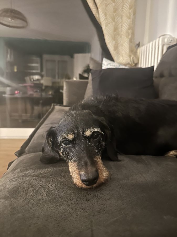 Suite au décès de ma mère, nous avons recueilli Spam, une adorable teckel à poil dur de 13 ans.