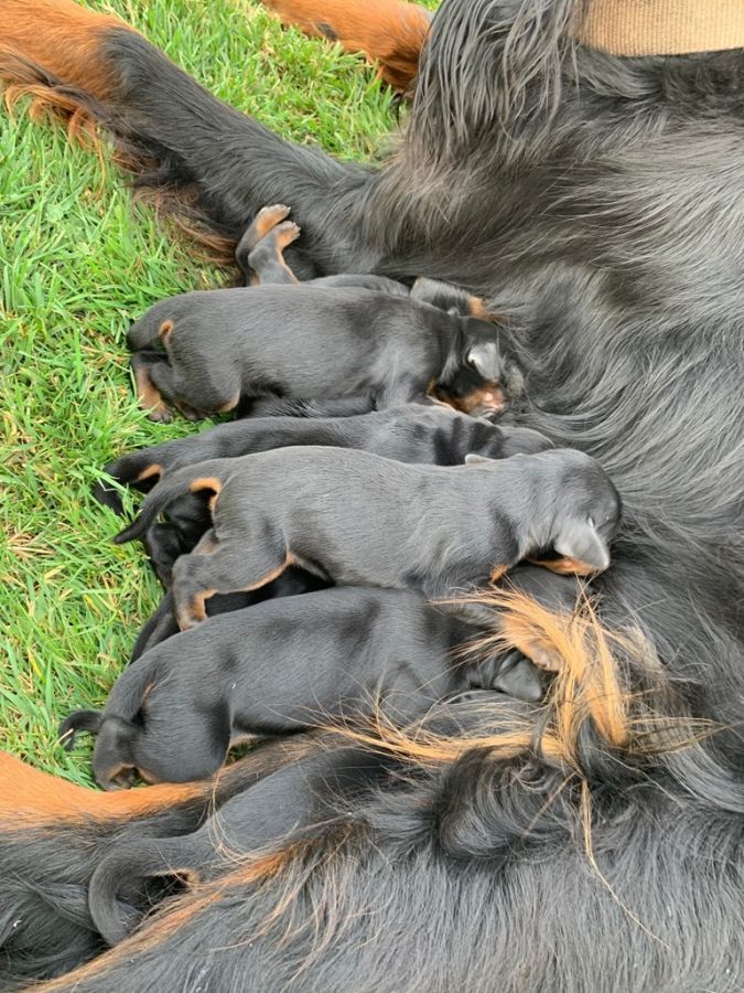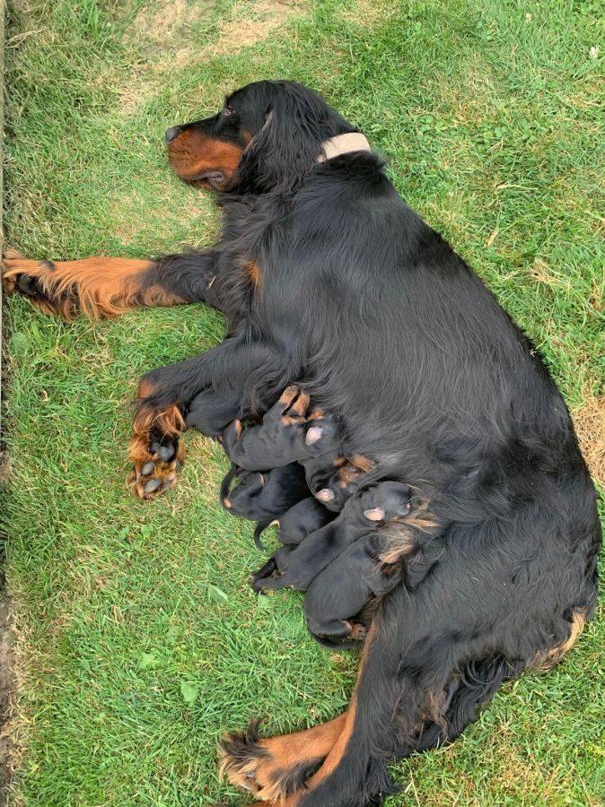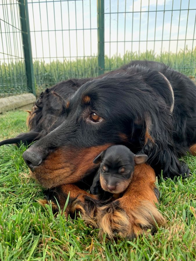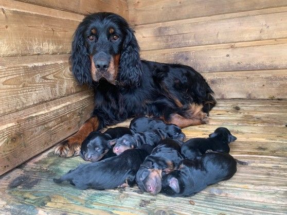 Particulier vend 8 Chiots Setter Gordon inscrits au LOF nés le 13 Juin 2025 issus de l'union de Ninja de la Vallée de la Leyre et de Tosca de la Sorcière Briarde. Il y a 2 mâles & 6 femelles. Parents extra chasse, père Trialer, mère TAN. Mère, grand-mère et arrière grand-mère visibles sur place. Santé père: dysplasie A, NCLD 1-2, HA 1-1, RCD4 1-1 . Santé mère dysplasie B, NCLD 1-1, HA 1-1, RCD4 1-2 Disponibles à partir du 8 Août, ils seront pucés, vaccinés & vermifugés, il y aura également le certificat de bonne santé qui sera établi par le vétérinaire. Mâle à 1000 €, Femelle à 1200 €.