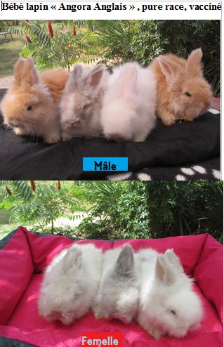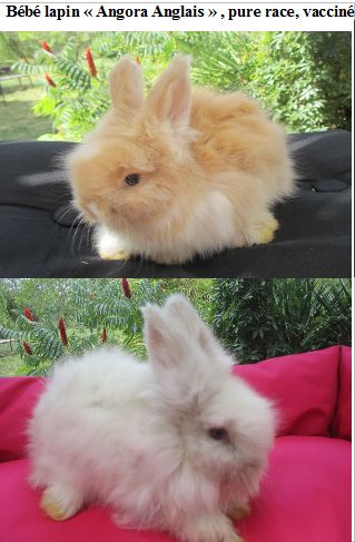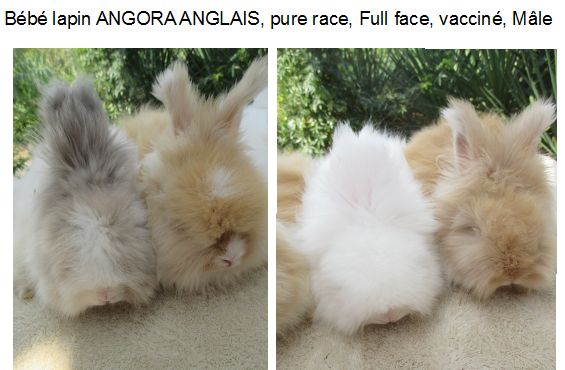 Bébé lapin pure race ANGORA ANGLAIS, Full Face,  ils ont été vaccinés par un vétérinaire, contre VHD 1 et 2  et MYXO ,  carnet de santé fourni ! élevé en famille à la maison, habitué aux chiens et chats, il reste un mâle beige à 85e, et une femelle blanche avec un peu de gris à 100