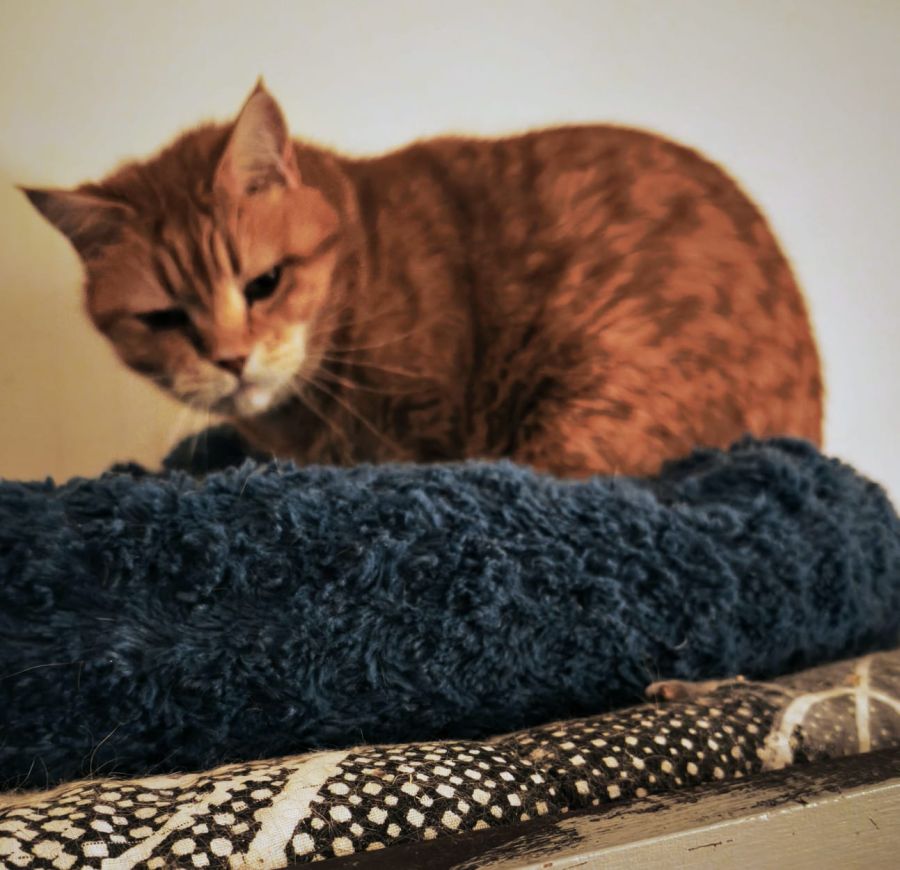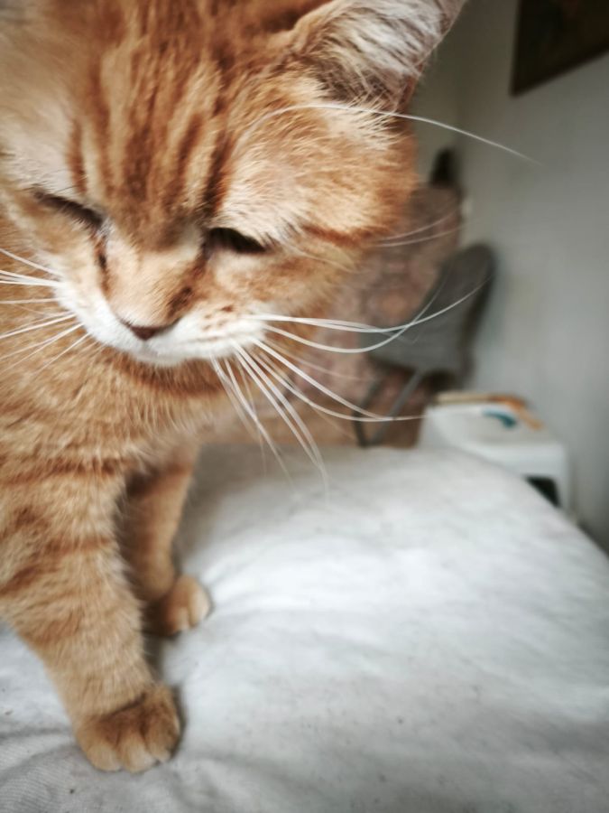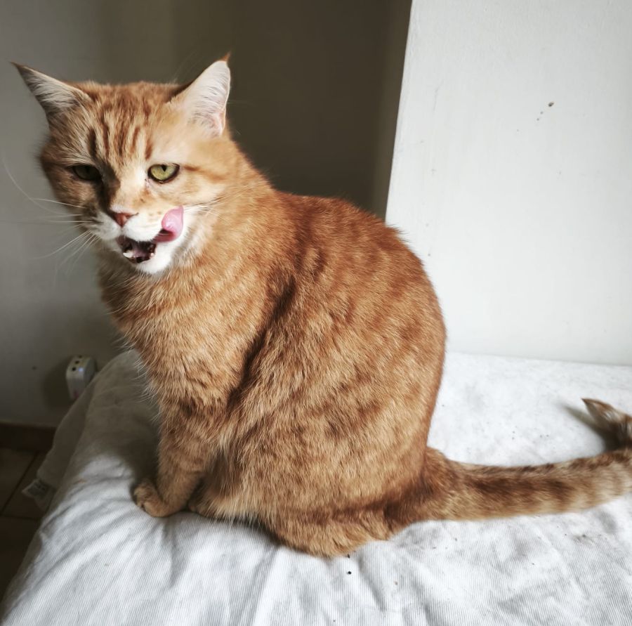 C’est un chat sociable, qui vient chercher les caresses, mais qui est encore sur la réserve avec les autres chats. Il n’est pas agressif, mais plutôt craintif et leur crache dessus pour les tenir à distance.