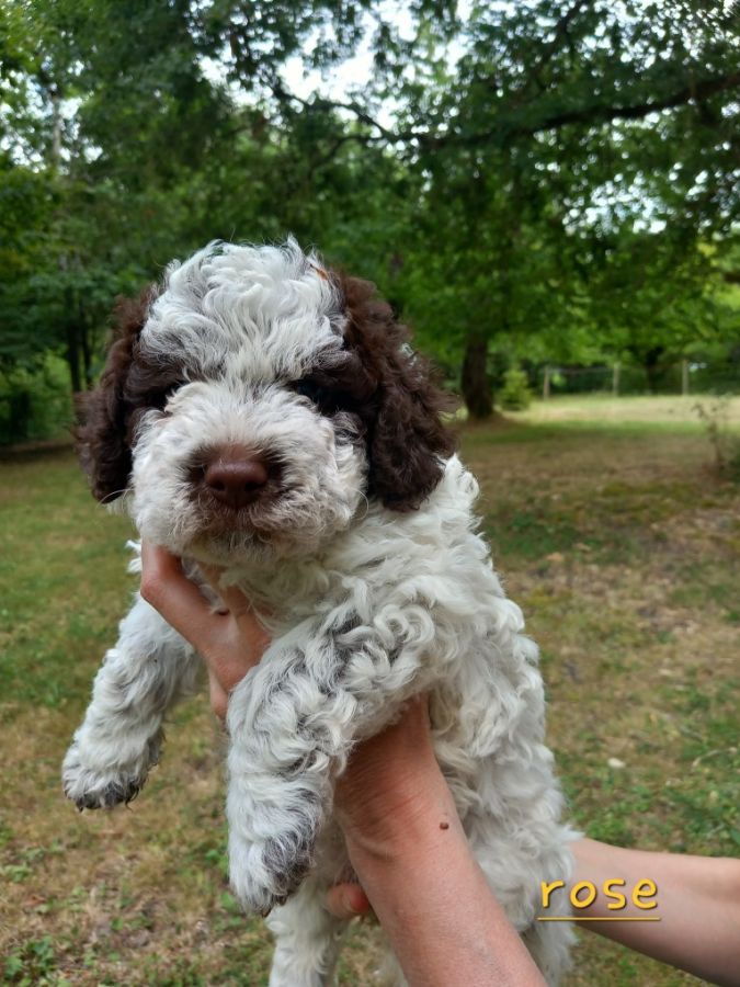 Sur une portée de 4 chiots Lagotto Romagnolo LOF, il reste une magnifique femelle bicolore (blanche et marron) qui attend sa famille. Elle a 2 mois et demi.