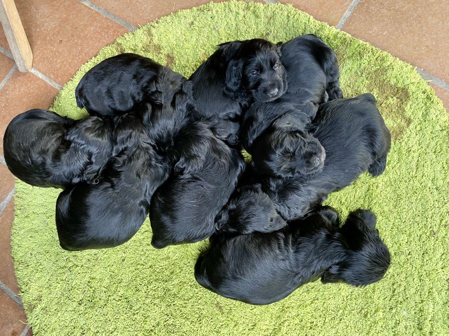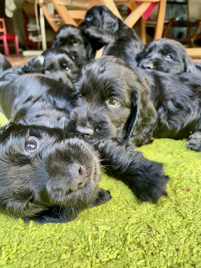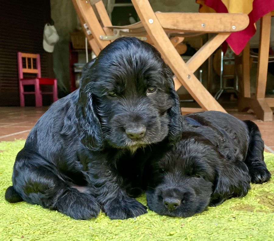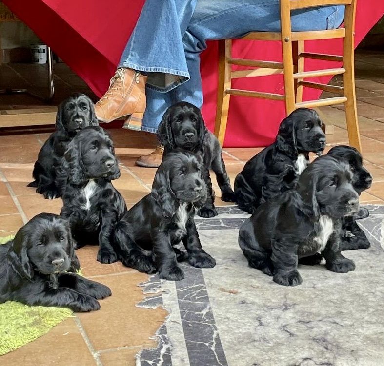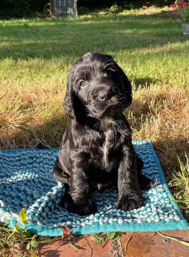 1 chiot Cocker Spaniel Anglais LOF à réserver, mâle, noir avec panachures blanches sur le ventre et les pattes.