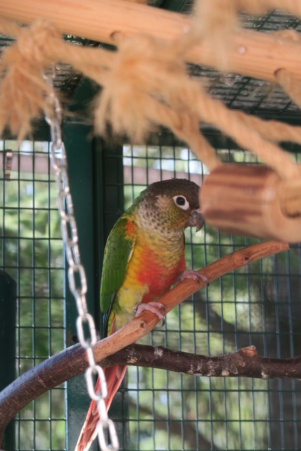 Une jeune femelle Pyrrhura Molinae EPP née en volière extérieure en avril 2025, tous trois manipulés au nid.