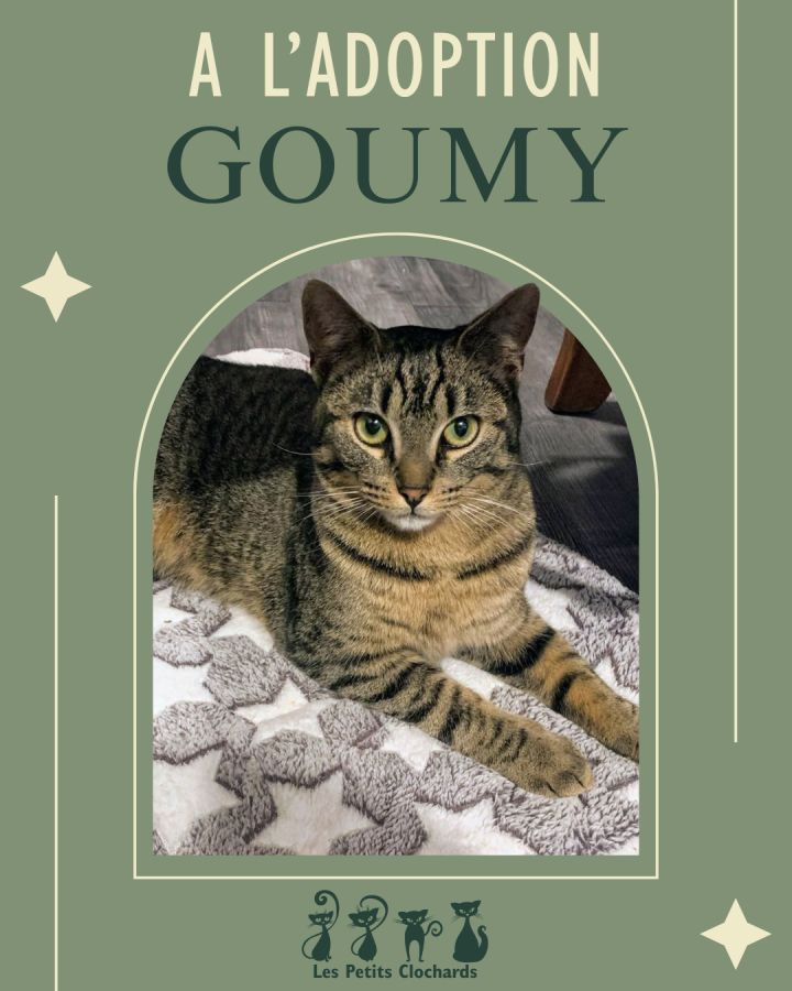 Goumy cache derrière sa timidité un cœur tendre qui ne demande qu'à s'ouvrir. Ce jeune chat au regard expressif attend une famille qui saura prendre le temps de le découvrir et l'aimer.
