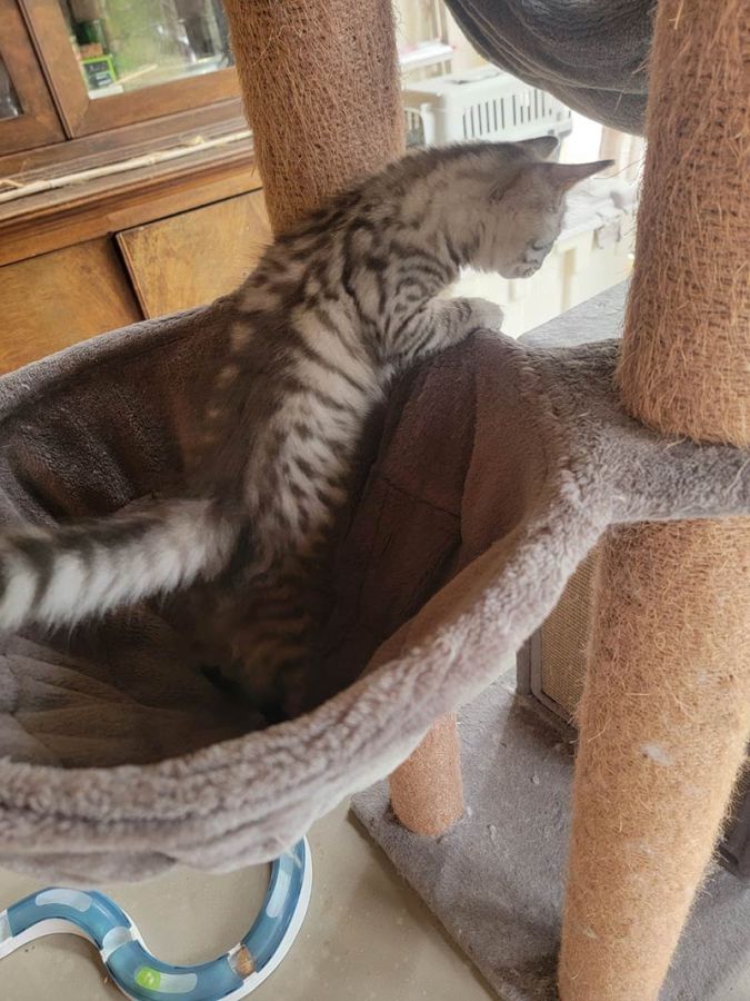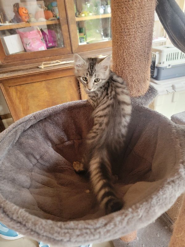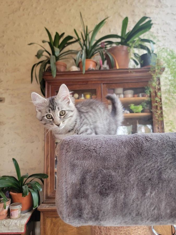 A céder une adorable chatonne de type Angora turc, née le 16 avril 2025 de couleur blue silver mackerel tabby, très joueuse et câline.