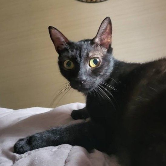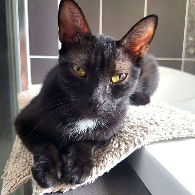 🐈⬛ Speak, femelle de quelques mois, charme par ses grands yeux jaunes pleins de mystère et son allure élégante.