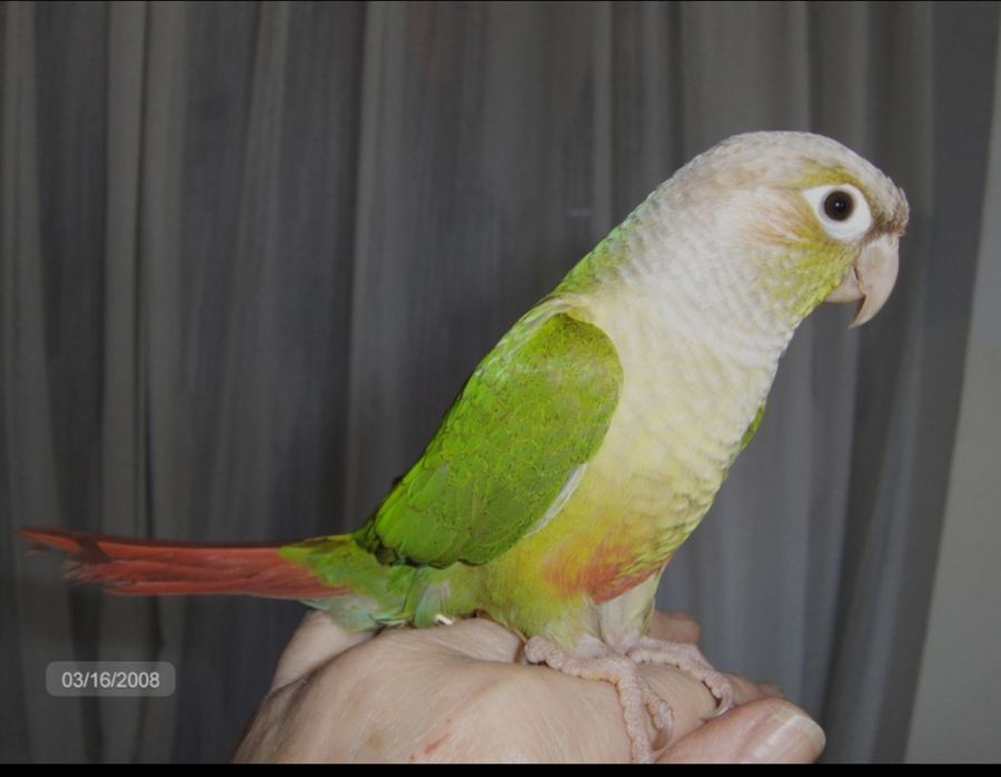 Jeune conure souris lutino née en juin femelle sexée ADN et baguée. Oiseau EAM remis en volière intérieure il lu...