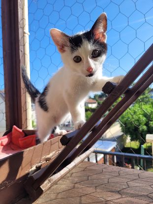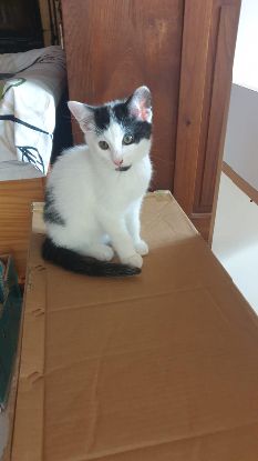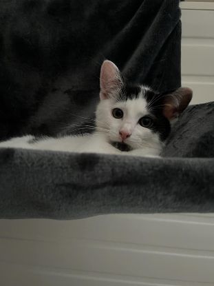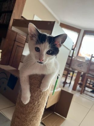WAPY est né en le 23/04/2025 chez un particulier. Il est un chaton de 2 mois 1/2 issue d’une fratrie de 4. Il vit en famille d’accueil avec son frère TSUKY avec lequel il est très proche, et avec 4 chats adultes. Il est une boule d’amour qui se met à ronronner dès qu’on s’approche de lui et réclame des caresses, si vous vous arrêtez il fait son miaou de bébé pour que vous continuez. Il aime le contact des humains, il va se coucher près de mon fils ni vu ni connu. Il est un adepte des arbres à chat qu’il escalade tel un alpiniste. Il adore faire des glissades sur les feuilles de cours de ma fille qui, loin de lui en vouloir, rigole de ses prouesses. Un sacré sportif ce petit diablotin ! Il joue beaucoup avec son frère TSUKY avec lequel il fait de longues siestes dans le hamac de radiateur mais aussi sur l’arbre à chat. Il est un gourmand raisonné mais quand les grands mangent leur pâtée, il n’hésite l pas à aller piocher dans leurs gamelles même s’ils font 4 fois sa taille, sous leurs regards ébahis. Mais sa famille d’accueil lui prépare la sienne afin d’éviter les conflits et il la mange goulument.