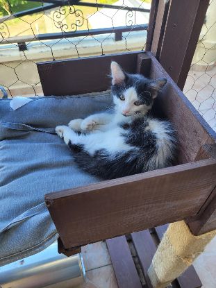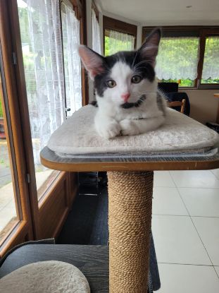 TUSKY est né en le 23/04/2025 chez un particulier. Il est un chaton de 2 mois 1/2 issue d’une fratrie de 4. Il vit en famille d’accueil avec son frère WAPY avec lequel il est très proche, et avec 4 chats adultes. Il est une boule d’amour qui se met à ronronner dès qu’on s’approche de lui et réclame des caresses, si vous vous arrêtez il fait son miaou de bébé pour que vous continuiez. Il est un adepte des arbres à chat qu’il escalade tel un alpiniste. Il aime les cannes à pêche, les plumes, les balles à grelot qu’il balade dans toute la maison tel un footballeur professionnel. Il joue beaucoup avec son frère WAPY avec lequel il fait de longues siestes dans le hamac du radiateur mais aussi sur l’arbre à chat. Il s’approche avec prudence des chats adultes avec lesquels il vit depuis peu de temps, la cohabitation se passe de mieux en mieux. Il n’est pas un gourmand, le jeu et la sieste sont plus importants pour lui.