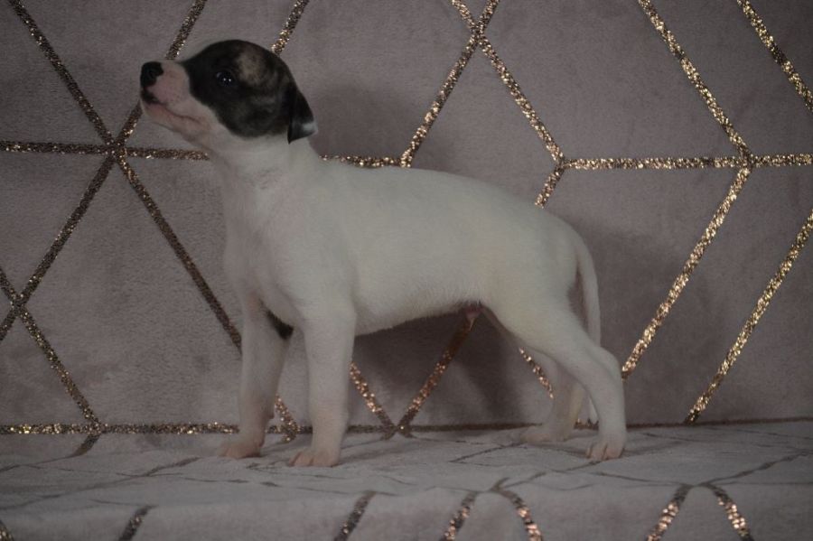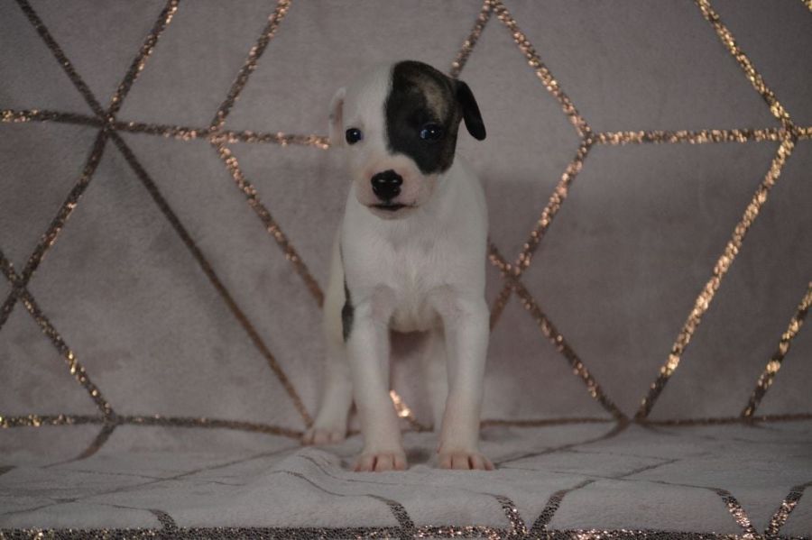 Voici : ARTAX Garçon tout doux, presque entièrement blanc avec une tâche sur le flanc droit et son petit coquard côté gauche.
