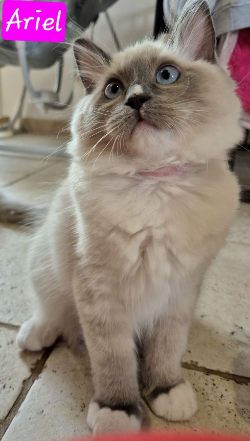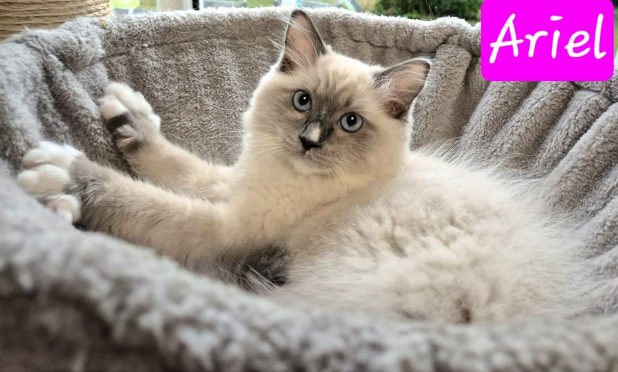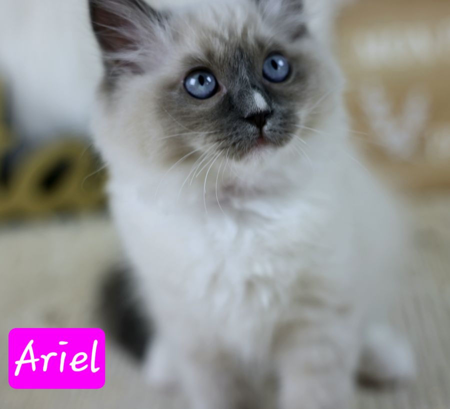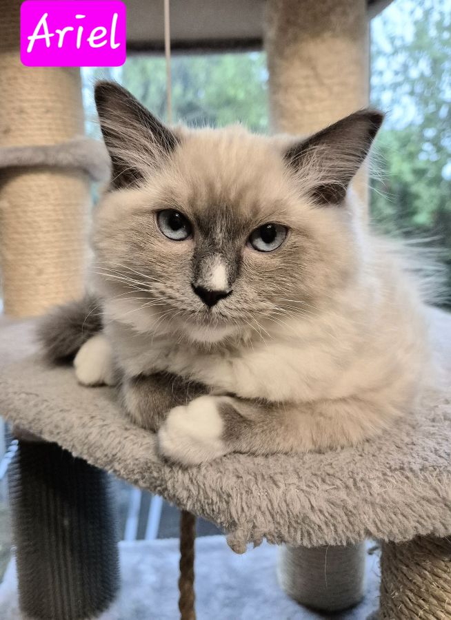 – Ariel : douce et posée, très câline, elle observe avant de se lancer dans le jeu