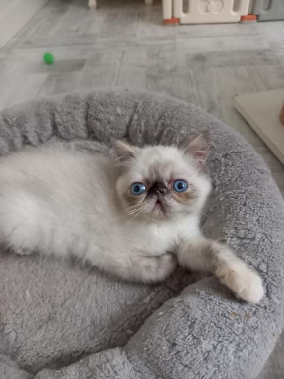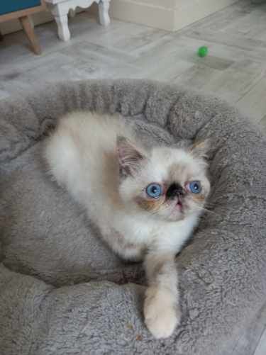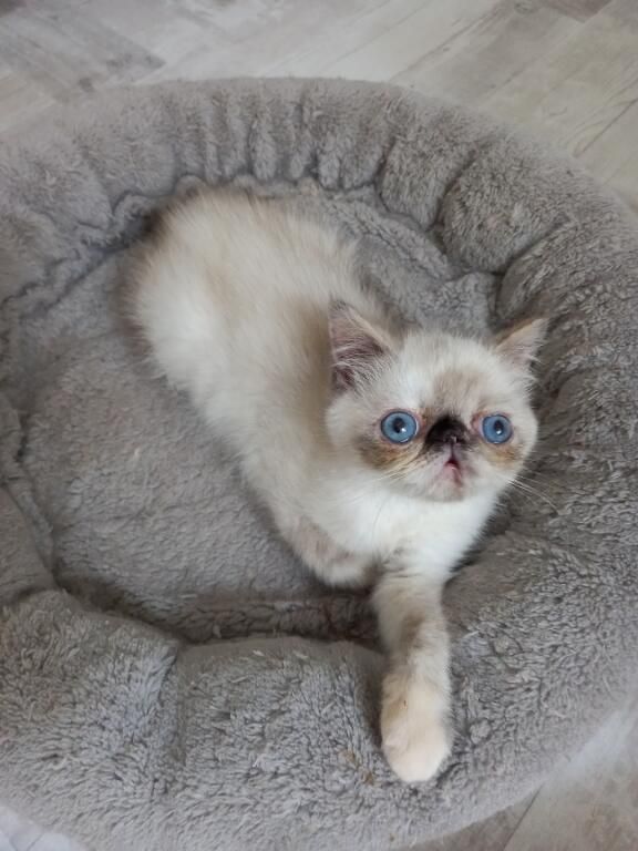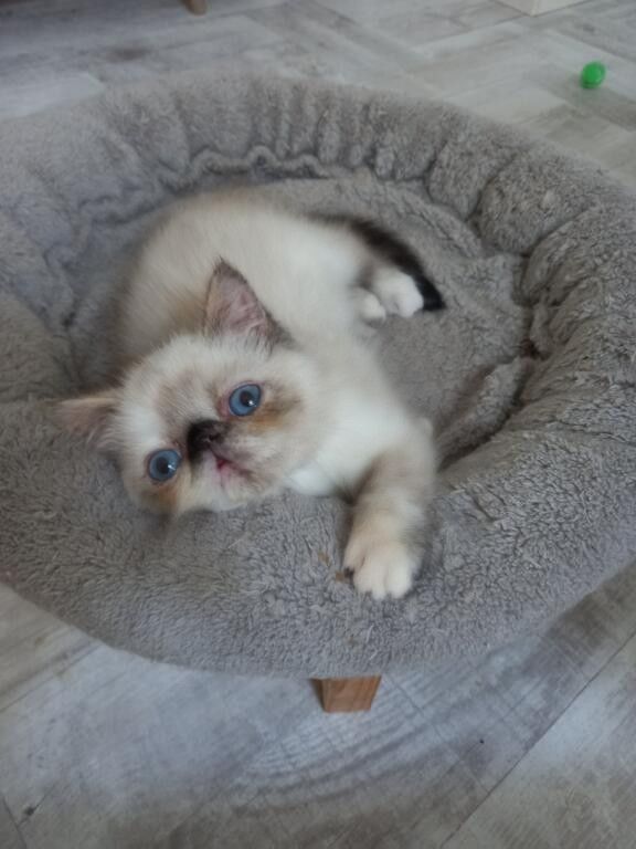 femelle exotic shorthair née le 06/04/2025 de couleur blue point et blanc gardera donc ses grands yeux bleus, puce 250268781757908 entièrement vaccinée, vermifugée régulièrement certificat de bonne santé délivré par ma vétérinaire.