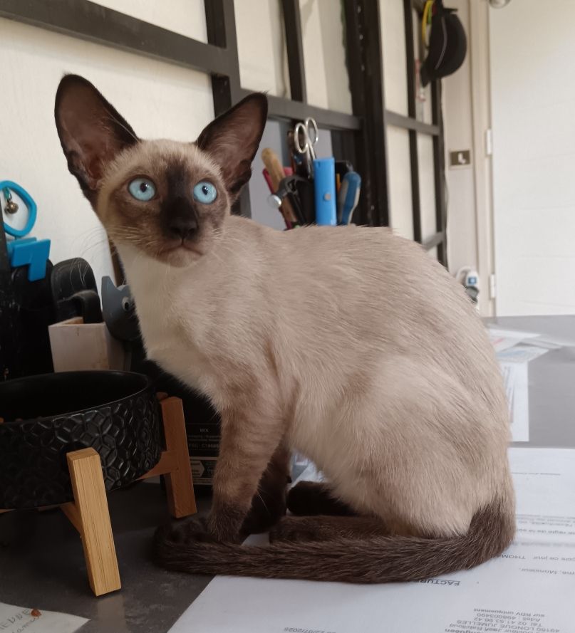 A vendre chaton femelle née le 15 avril 2025, vaccinée (rappel) le 21 juillet 2025 ( typhus, coryza, leucose, chlamydiose) puce ICAD n° 250269592019843, n° portée LOOf 83962469-2025-1, couleur robe: seal point, yeux bleus, prénommée: AUMELIE de Thai-Noy.