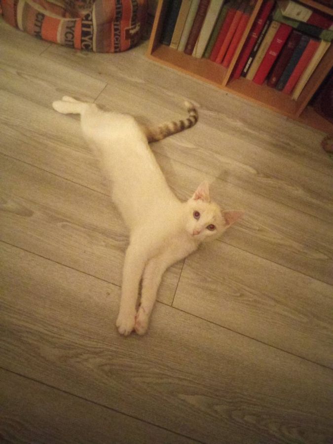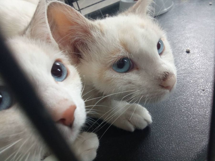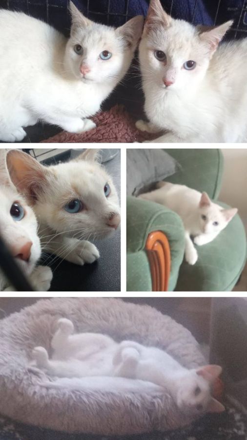 Isis et Lady, deux superbes minettes au pelage couleur neige et aux yeux bleus océan. Elles possèdent une petite queue rayée qui fait tout leur charme! Ces deux louloutes n'ont pas eu un début de vie facile, récupérées très maigres, couvertes de plaies et avec différentes blessures, elles se sont bien remise et reprennent doucement confiance en l'Homme.
