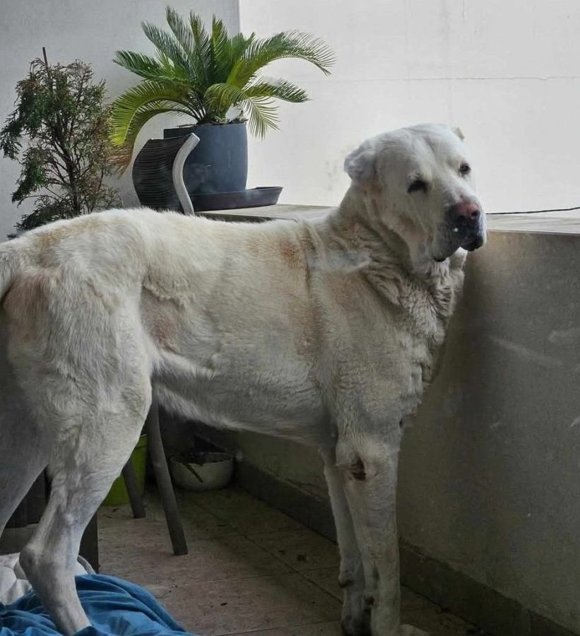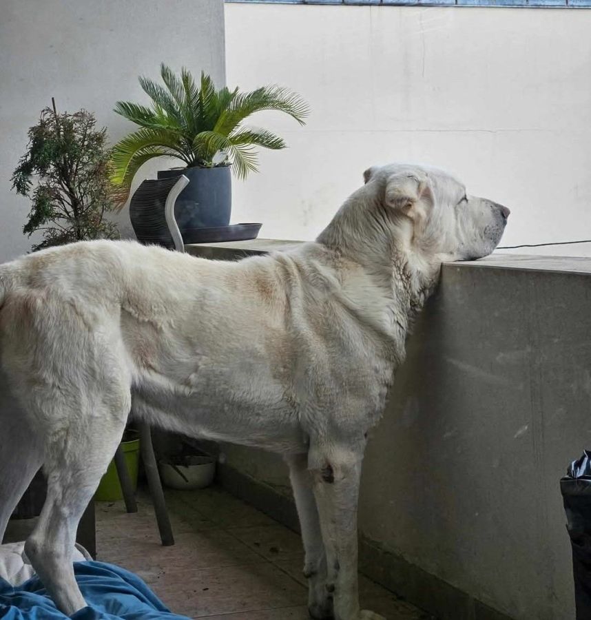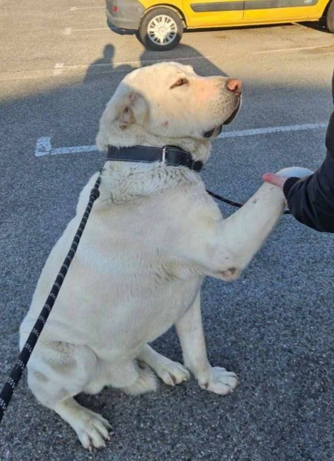 Très fort, gros gabarit de 80 kg, très difficile à promener. Au premier abord, sociable avec les congénères, mais peut se battre, et intervention obligatoire de l'humain. Très gentil avec ses proches, réclame de l'attention.
