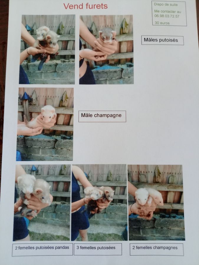 Bonjour je met en vente des jeunes furets de 2 mois mâles ou femelles champagnes blancs ou putoises