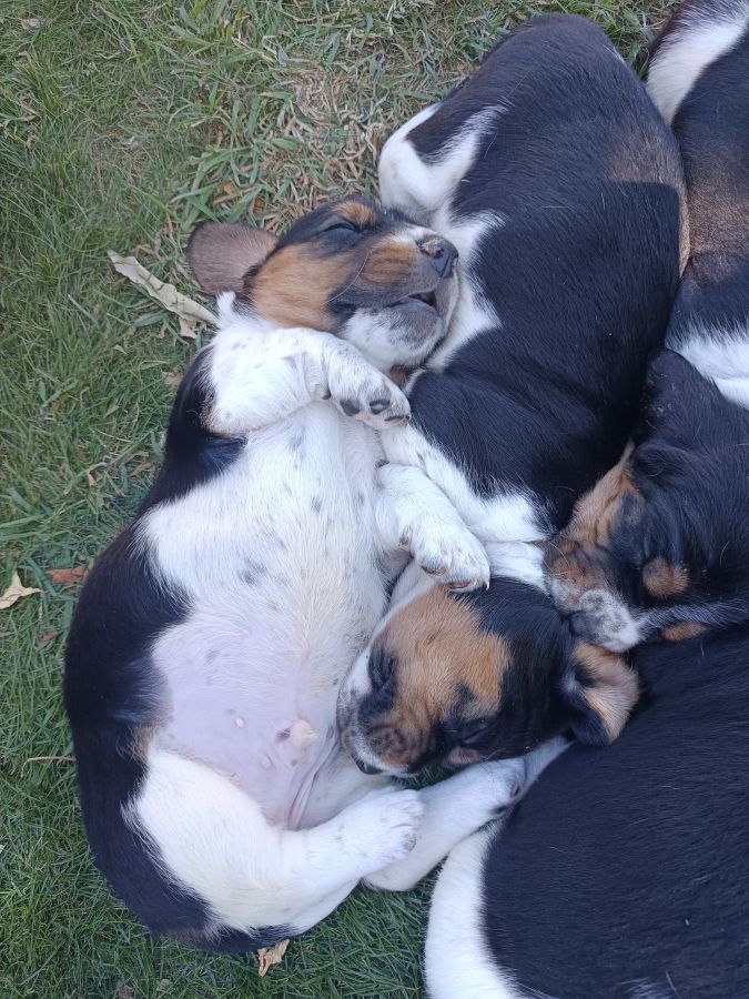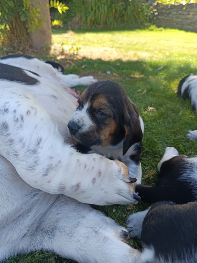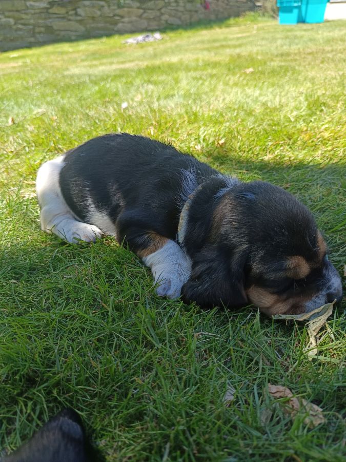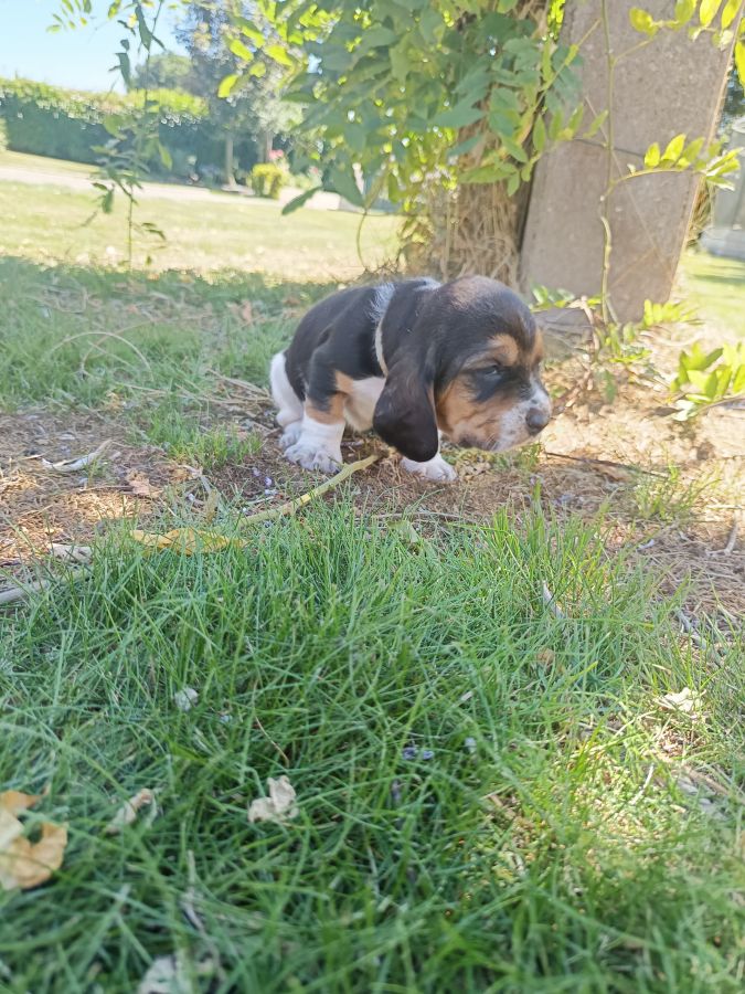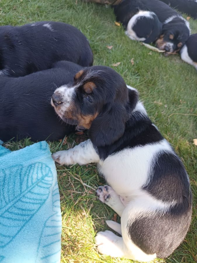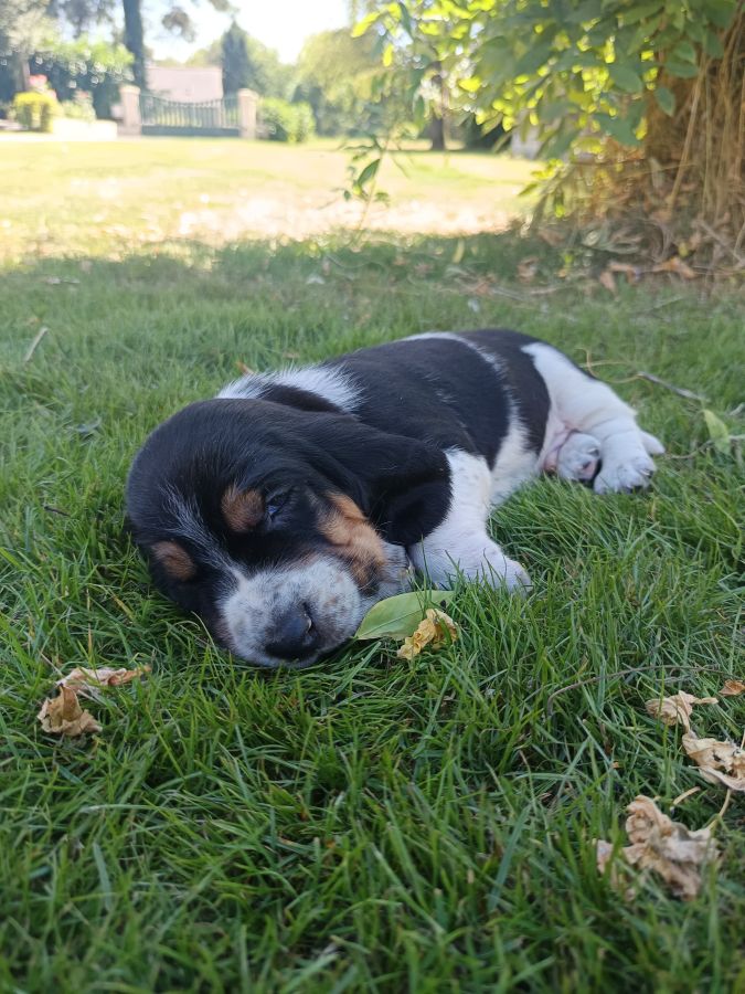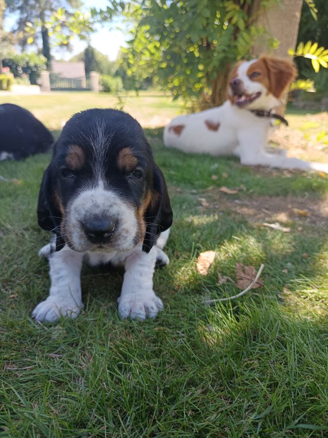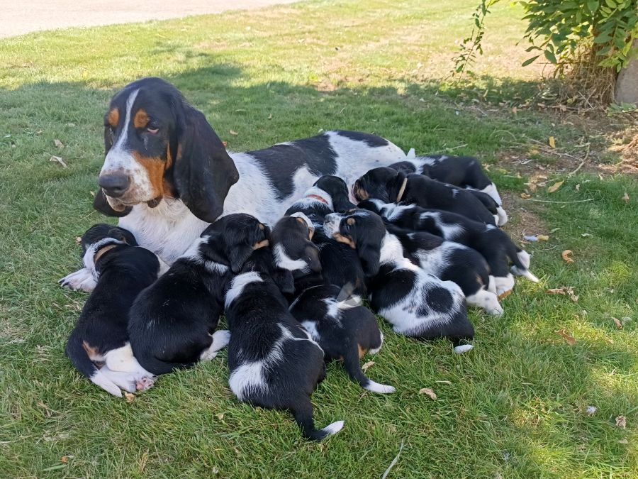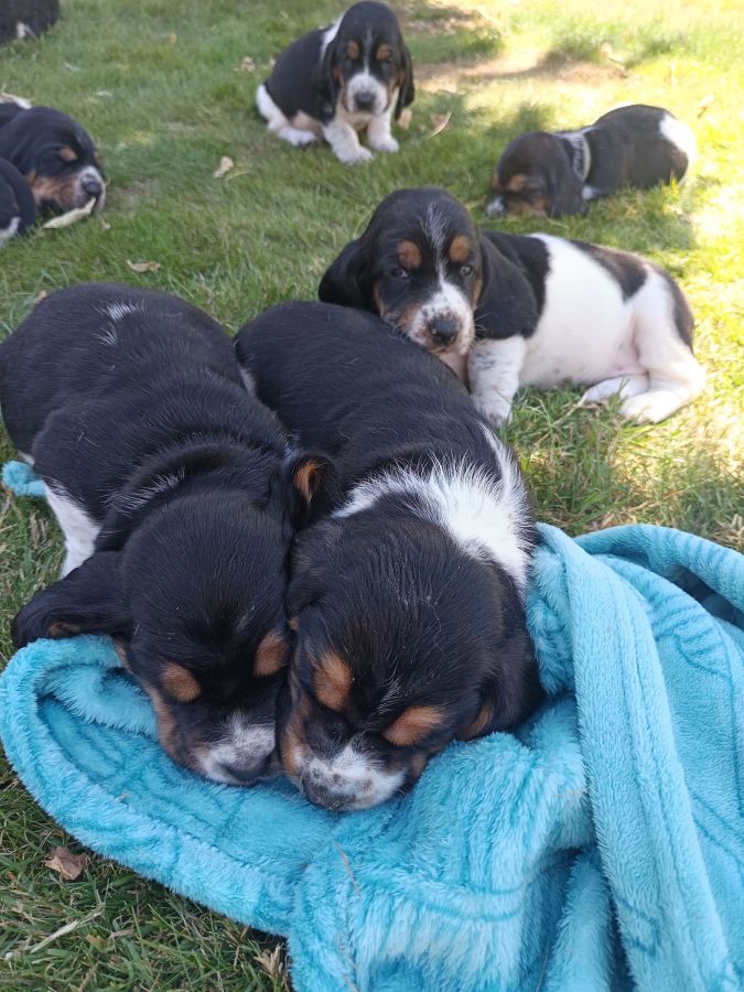 11 chiots Basset Hound LOF tricolores nés le 16 juillet à réserver pour un départ vers mi-septembre.