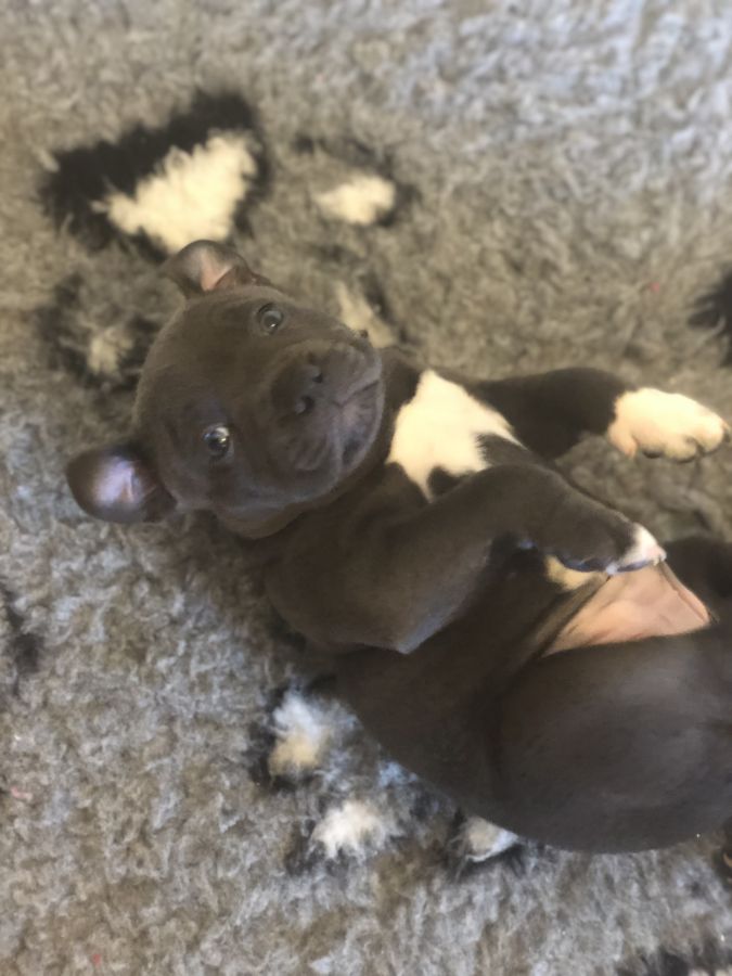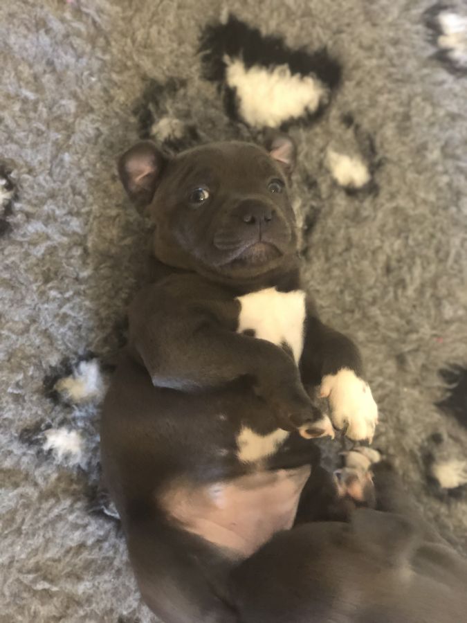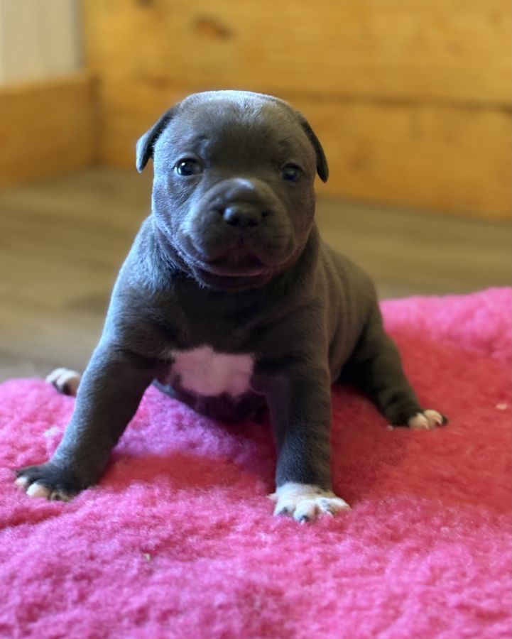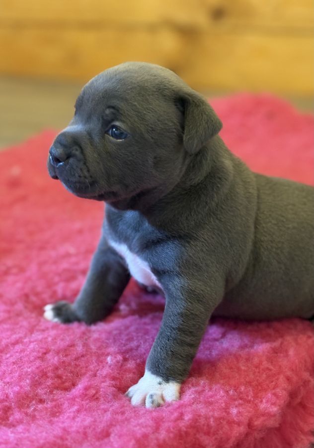A réserver une femelle Staffordshire Bull Terrier bleu disponible à partir du 14 septembre élevé avec respect au sein de notre famille, les adultes sont des chiens de canapés, ils ne vivent pas en chenil.