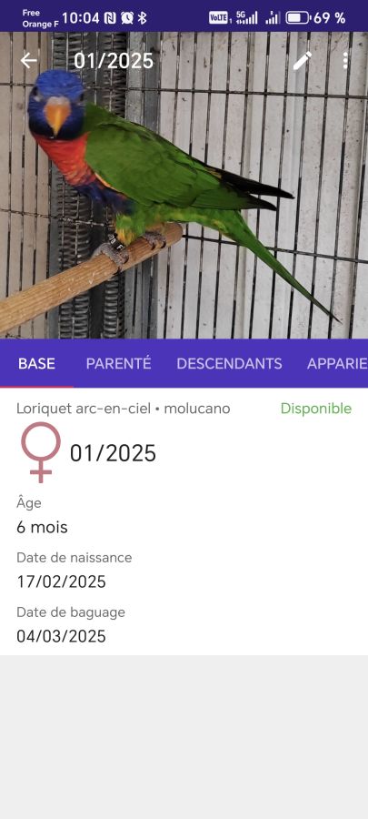 Bonjour je vends une femelle lori Arc en ciel avec 6 mois élevée à la main très aimable