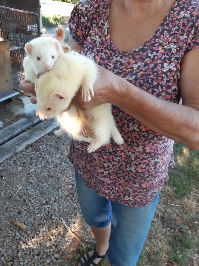 Jeunes furets nés début mai ,ils sont trés sociables , je les nourris avec de la viande et des croquettes.