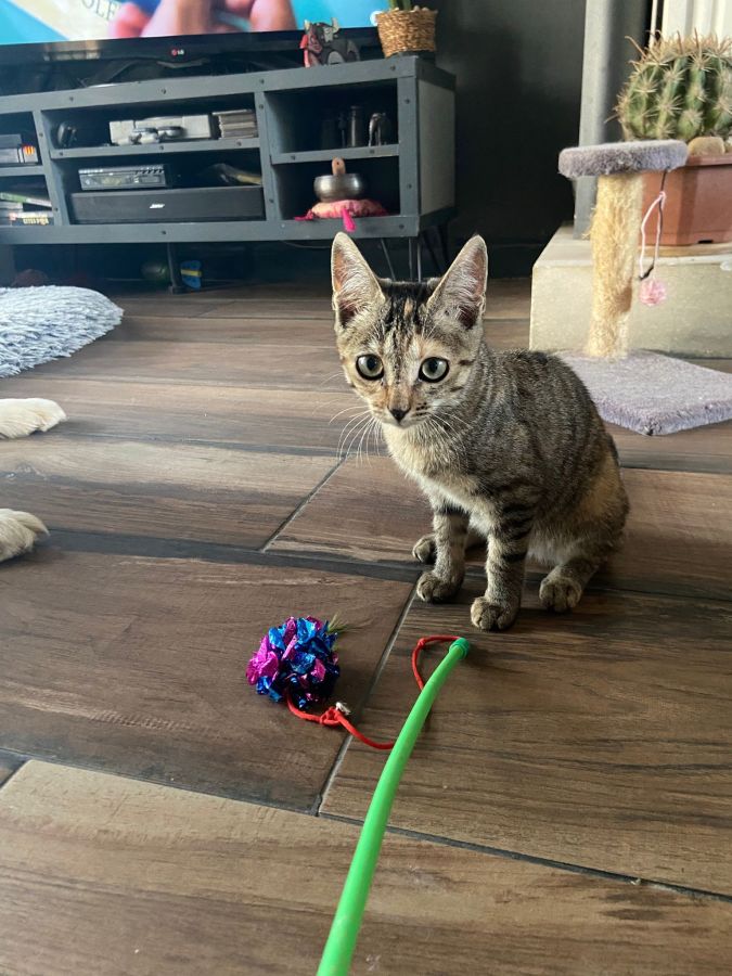 Ania est une adorable petite chatte tigrée grise en cours de sociabilisation.