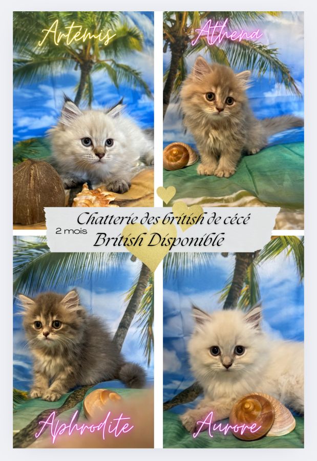 🐾 À réserver – Chatons British Longhair 🐾 📍 Lieu : Nice 📅 Disponibles à partir du : 10/10/2025 De magnifiques chatons British Longhair sont disponibles à la réservation. Nés le 10/07/2025, ils sont élevés dans un cadre familial, sociabilisés avec les enfants et habitués aux bruits du quotidien. C’est des chatons élevé avec amour, passion, ils sont adorables et tellement mignon que je recherche une famille avec plein d’amour. Ils sont issus de parents testés et inscrits au LOOF. 🐱 Race : British Longhair 📘 Prénom : Artémis, Athena, Aphrodite et Aurore 🎨 Robe(s) : blue golden shaded point, lilas golden shaded, blue tortie golden shaded. 🧬 Parents testés : PKD, FIV, FELV – résultats négatifs 🧠 Caractère : Calme, câlin, joueur, très proche de l’humain 💉 Les chatons partiront : ✔ Vaccinés ✔ Vermifugés ✔ Identifiés par puce électronique ✔ Avec un certificat vétérinaire de bonne santé ✔ Kit chaton offert (croquettes, jouets, couverture, petit griffoir, doudou avec odeur de la fratrie…..) 💵 Prix : 1200 € 🔒 Conditions de réservation : Contrat + facture + acompte de 400 € 📄 Contrat de vente + certificat de cession fournis le jour du départ Pour tte question complémentaire je suis à votre disposition ou plus de photos. chatterie des british de cécé
