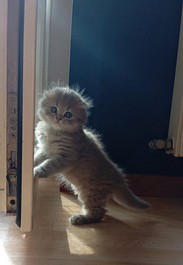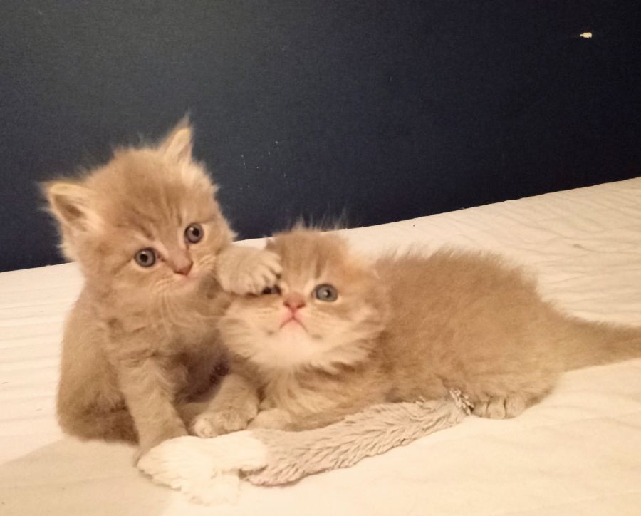 Ils sont issus du mariage de Perle Highland Straight non LOOF ( un pédigrée est manquant dans sa lignée) bleu smoke point et de Saiko Highland Fold LOOF red spotted tabby. Les Parents sont testés Fiv/Felv négatif.