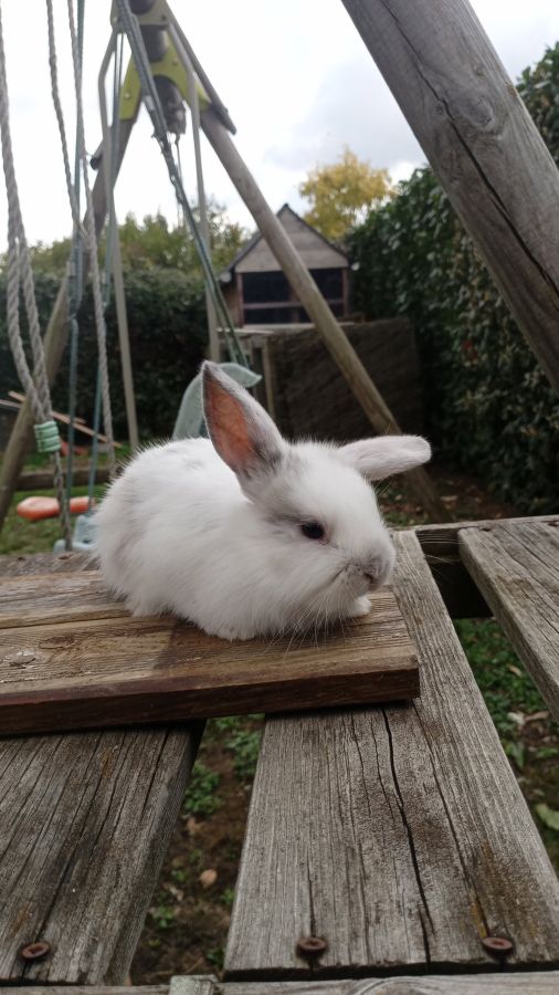 Donne petit lapin nain demi angora. Née d'un père angora et d'une mère poils ras. Il est d'un tempérament doux e...