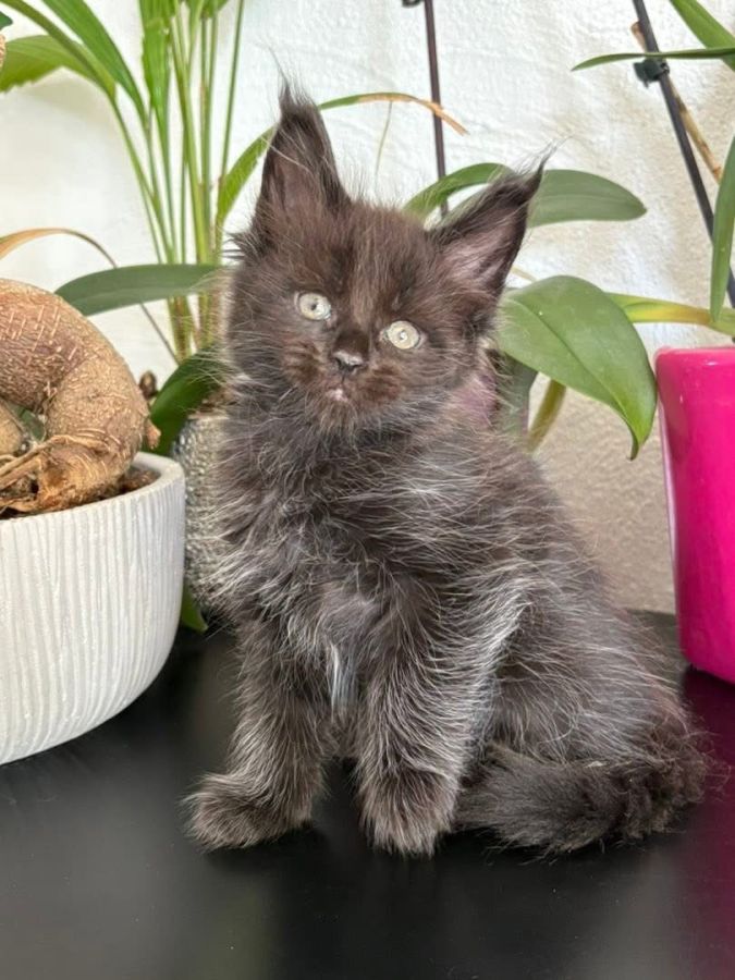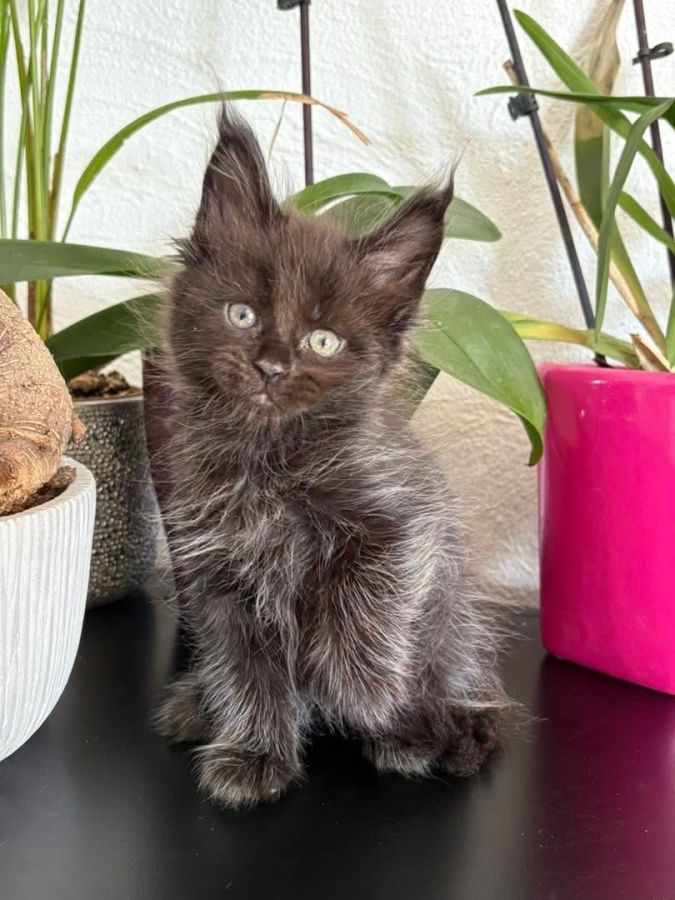Disponible à la réservation chaton Maine coon femelle née le 17/08/2025 inscrite au Loof d’une portée de 4 chatons.