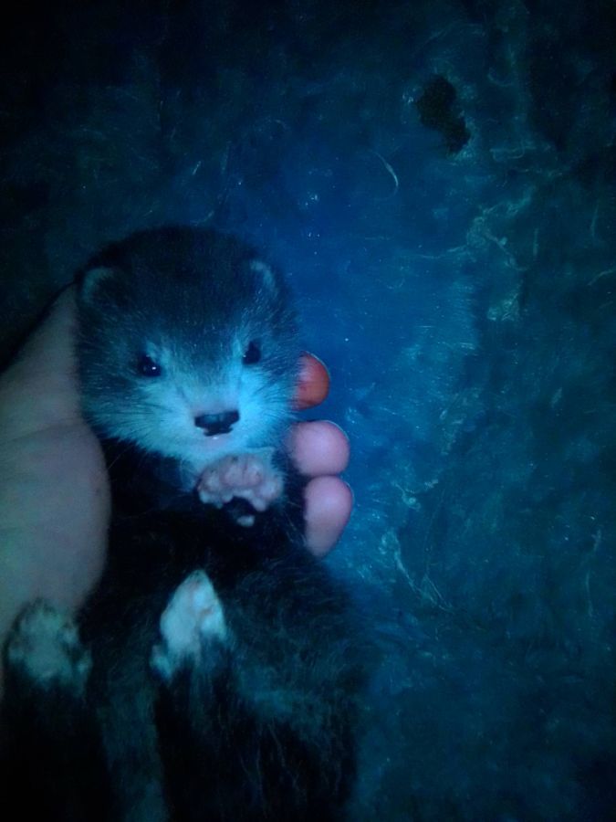 Née de l'union d'une furette Black Self Bouche de lait et d'un furet Silver Semi-Angora
